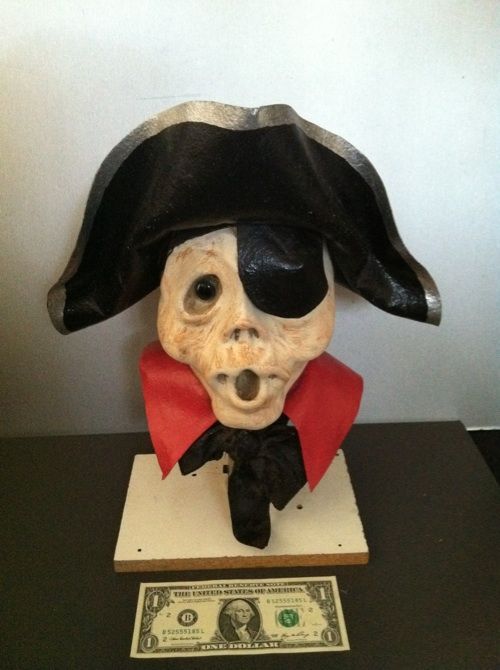 Offered here is an incredibly cool and creepy looking animatronic Pirate skull head with Captain Hat, Eye Patch, Collar and Ascot made of urethane. Makes a great display and perfect for use in your Haunt. [Stands are not included]