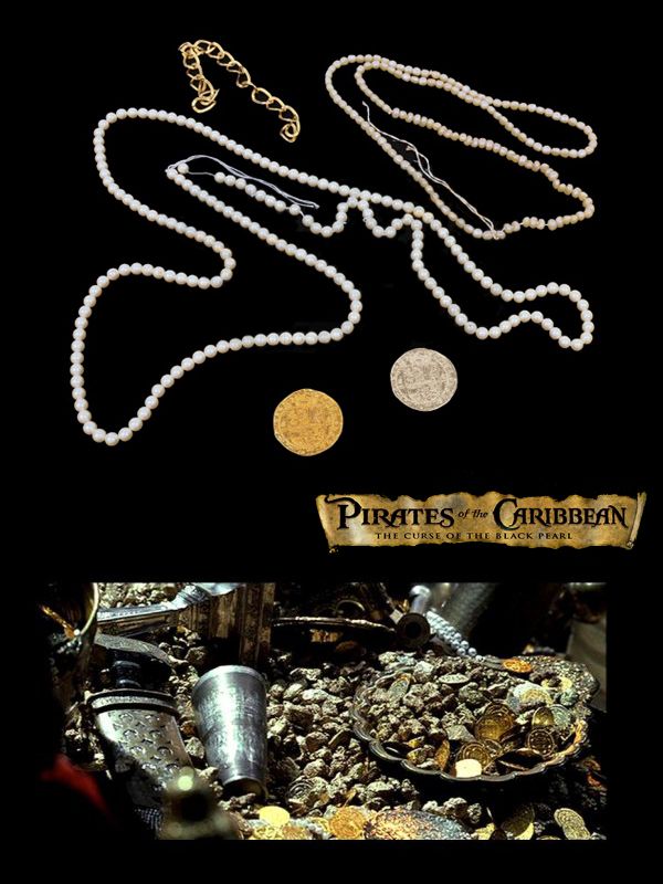 This is an awesome collection of 5 treasure props from PIRATES OF THE CARIBBEAN, CURSE OF THE BLACK PEARL. There is a length of gold chain, two large strings of pearls, a gold, and a silver coin. these will make a nice display all framed up together.