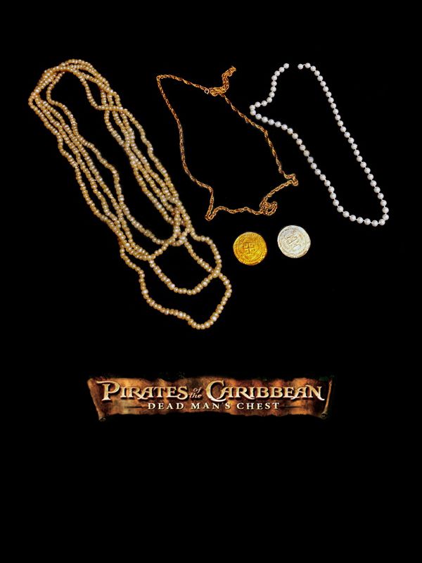 This is a nice collection of Prates treasure from CURSE OF THE BLACK PEARL. This lot includes 2 strings of pearls [one very large], a gold chain, a silver coin, and a gold coin.