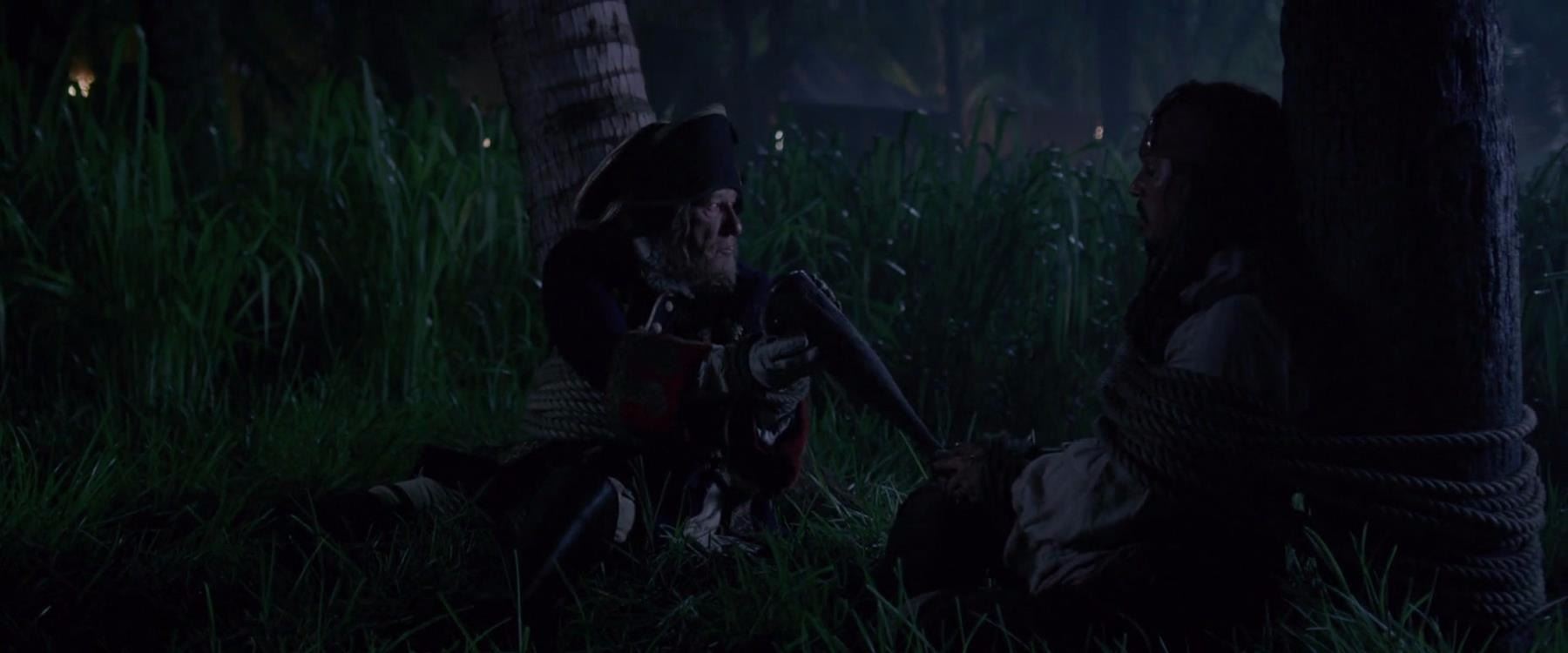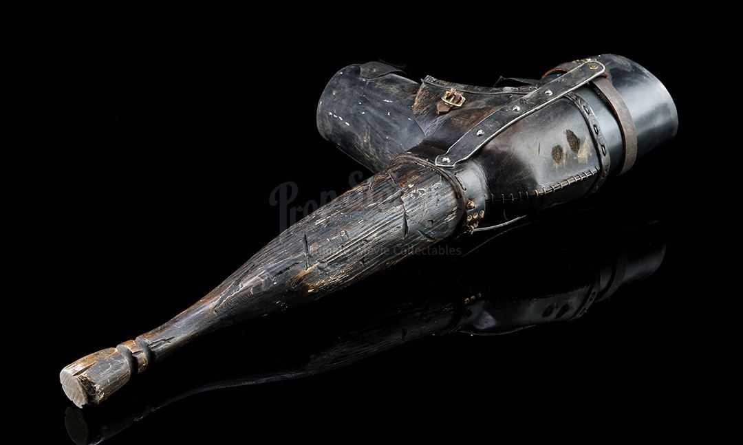 Captain Barbossa's (Geoffrey Rush) peg leg with a hidden flask from Rob Marshall's action-adventure sequel Pirates of the Caribbean: On Stranger Tides. In this fourth instalment of the Pirates series, Captain Jack Sparrow (Johnny Depp) and Barbossa attempt to find the fountain of youth before Blackbeard (Ian McShane). Barbossa walked on a peg leg throughout the film, and revealed its hidden flask when he was tied to a tree.
