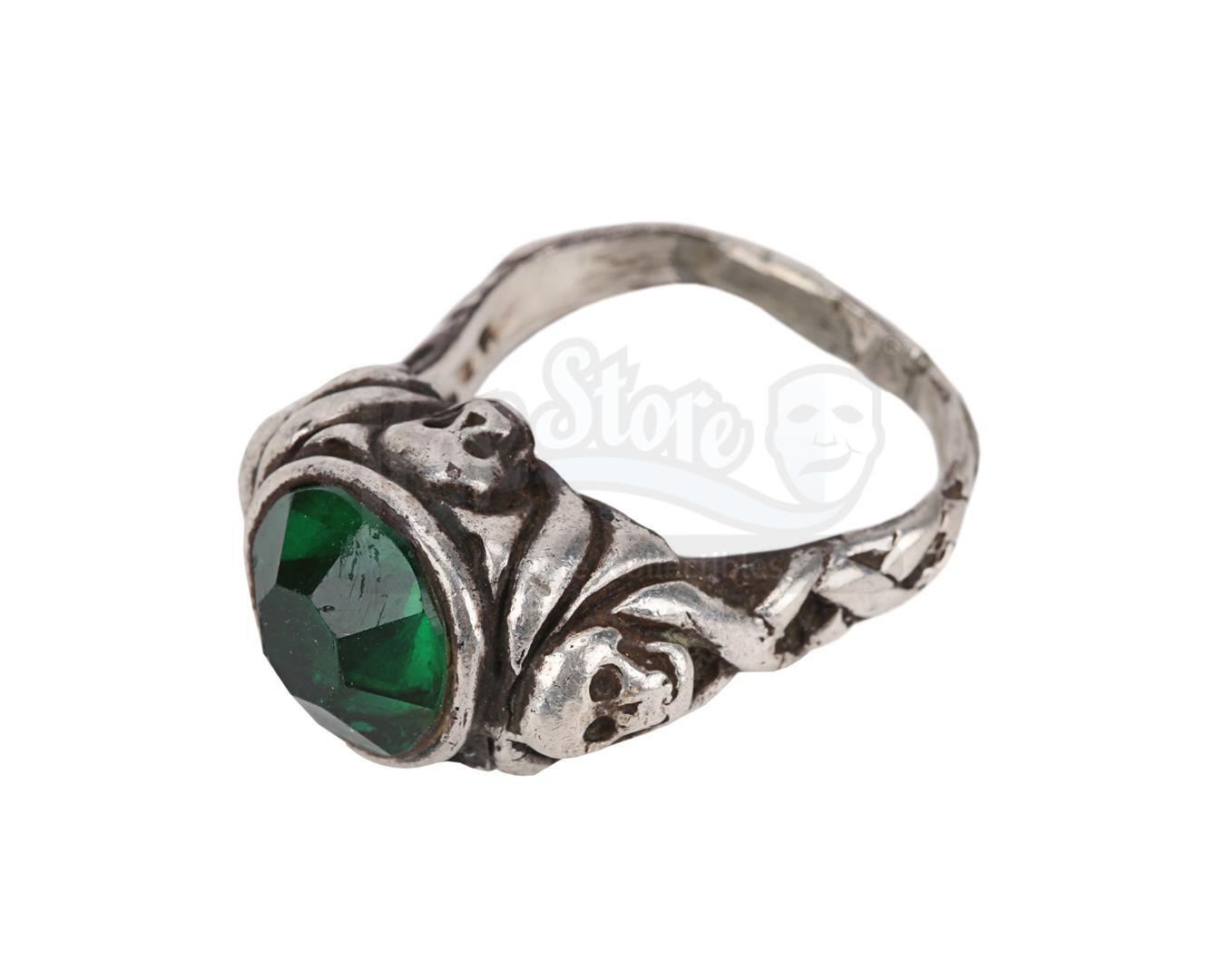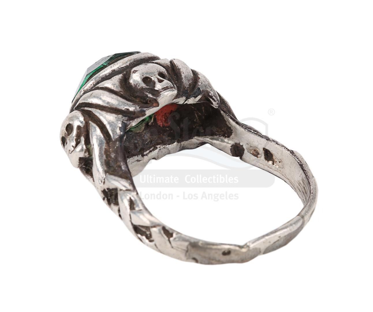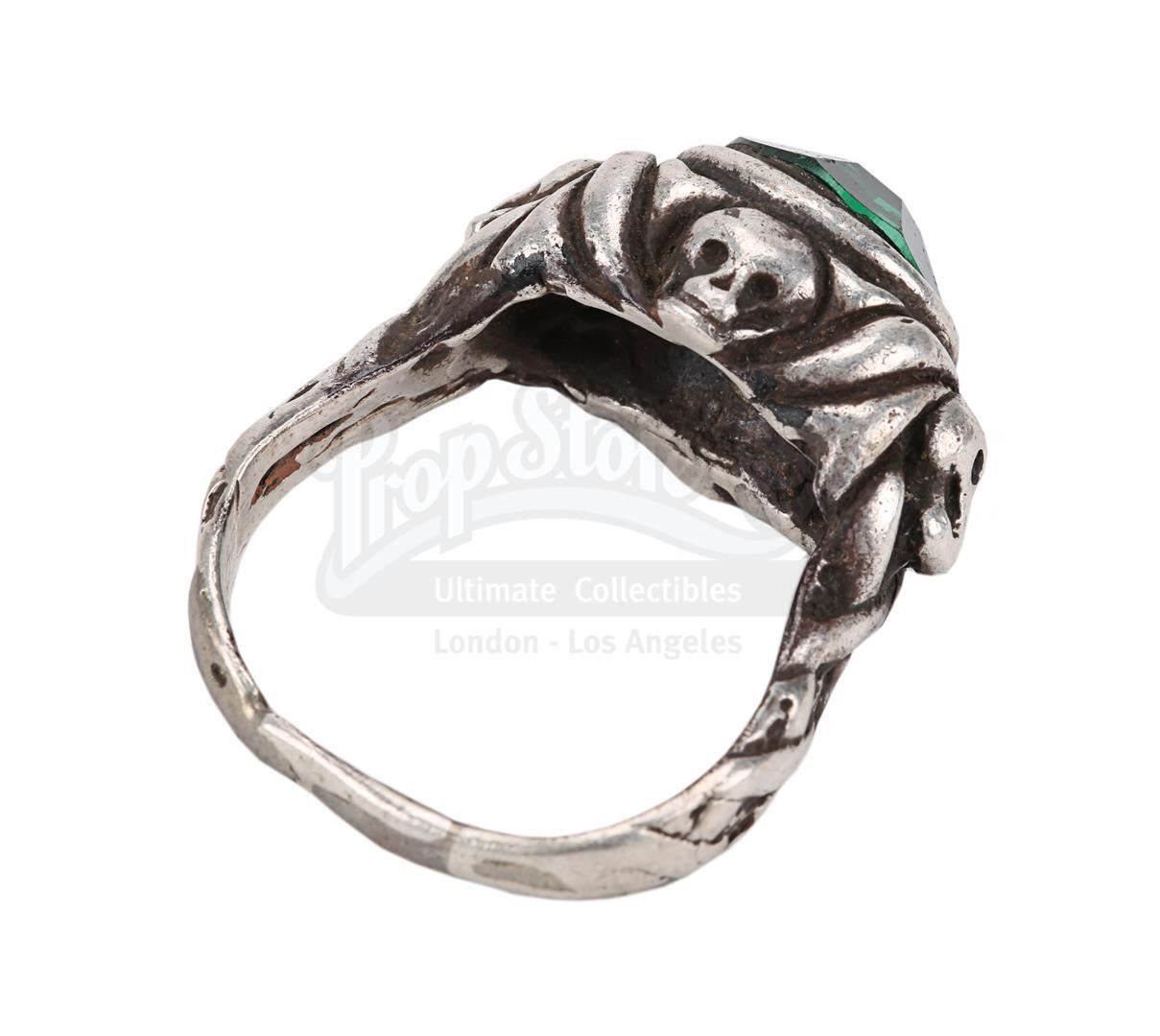 The ring is made of faux-silver metal with an inlaid green glass jewel in the centre. It features a headpiece with four cast skulls flowing into winding details down the ring's band. The lot exhibits signs of production use, including the squaring off of the bottom band for a comfortable fit, and light surface scratches on the jewel. Dimensions: 3.5 cm x 2.5 cm x 1.5 cm (1 1/2" x 1" x 3/4")