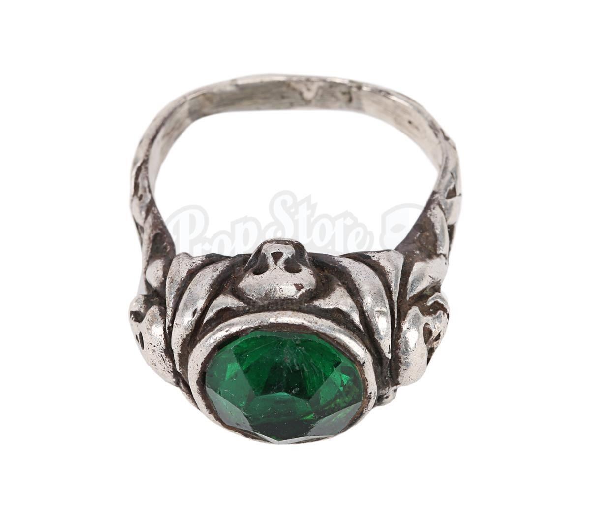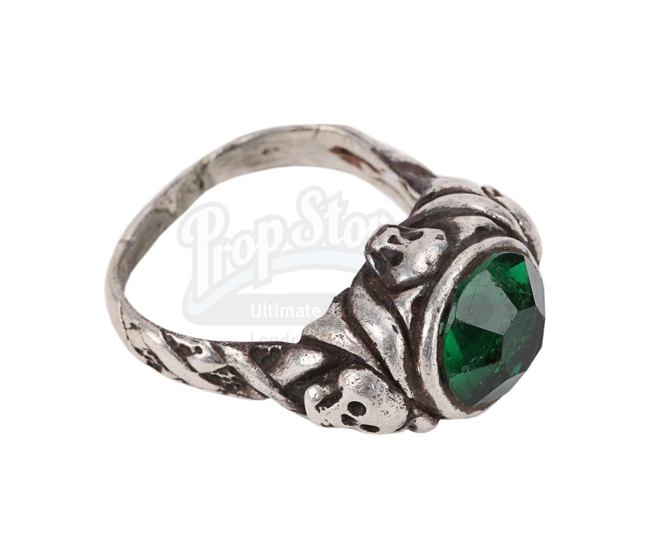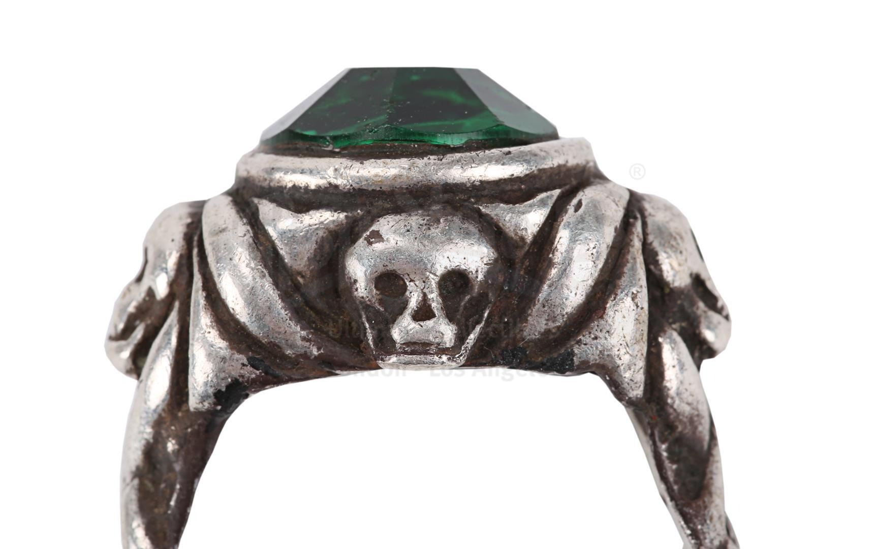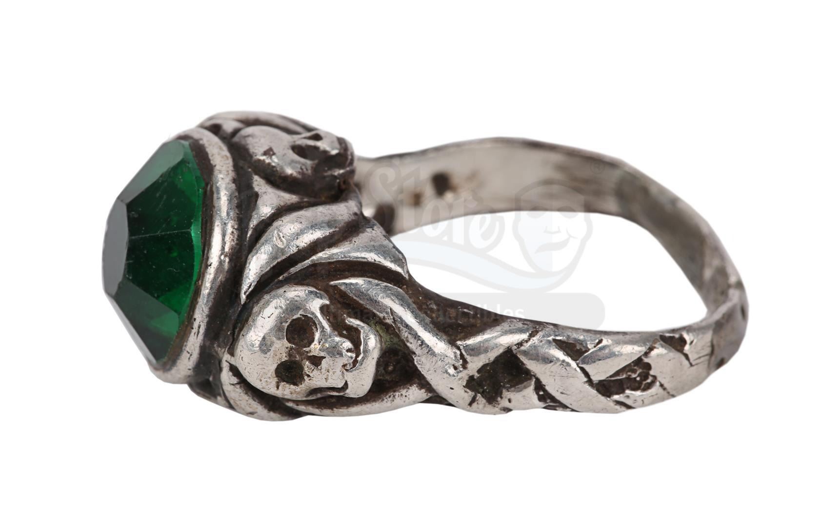 The ring is made of faux-silver metal with an inlaid green glass jewel in the centre. It features a headpiece with four cast skulls flowing into winding details down the ring's band. The lot exhibits signs of production use, including the squaring off of the bottom band for a comfortable fit, and light surface scratches on the jewel. Dimensions: 3.5 cm x 2.5 cm x 1.5 cm (1 1/2" x 1" x 3/4")