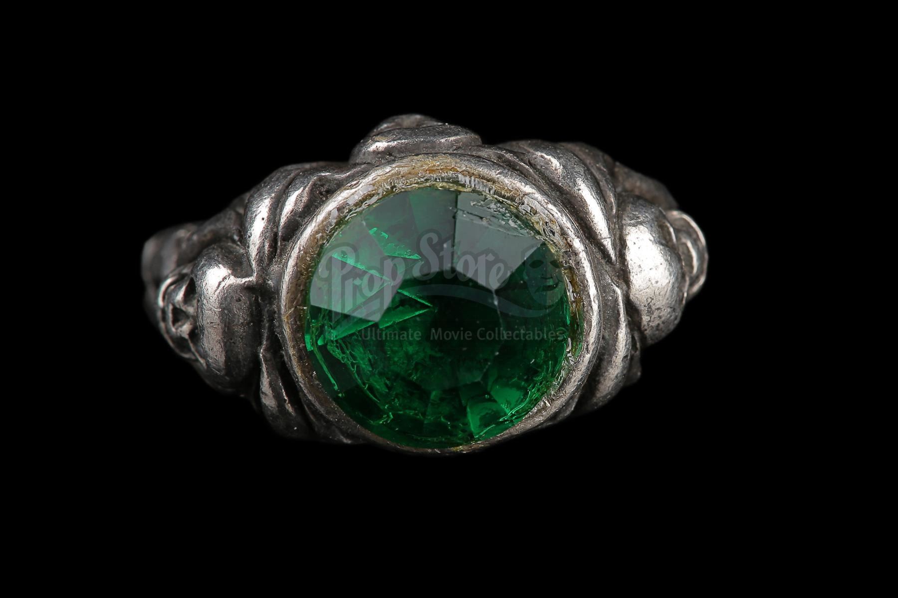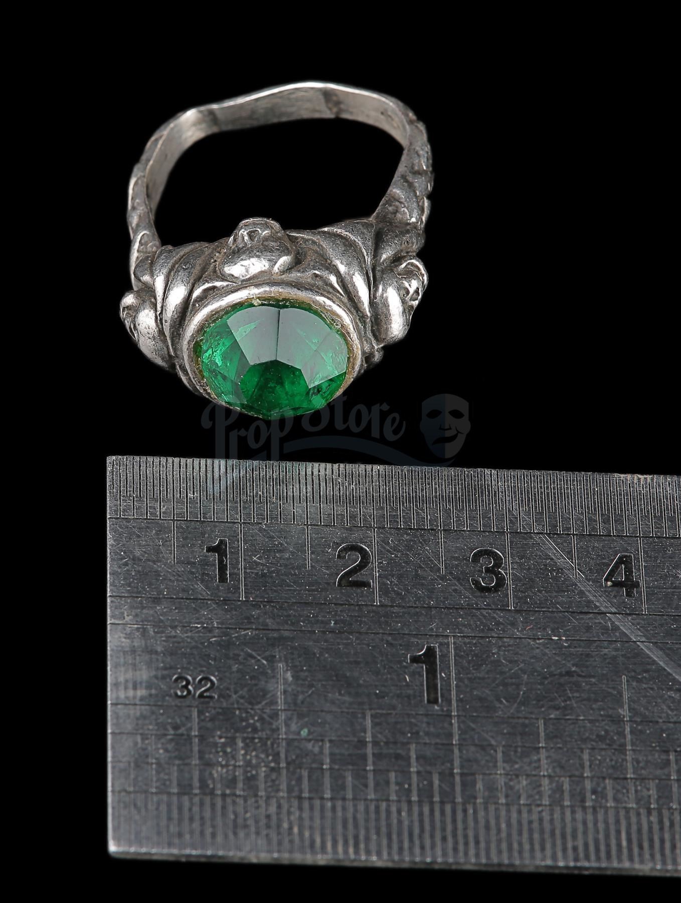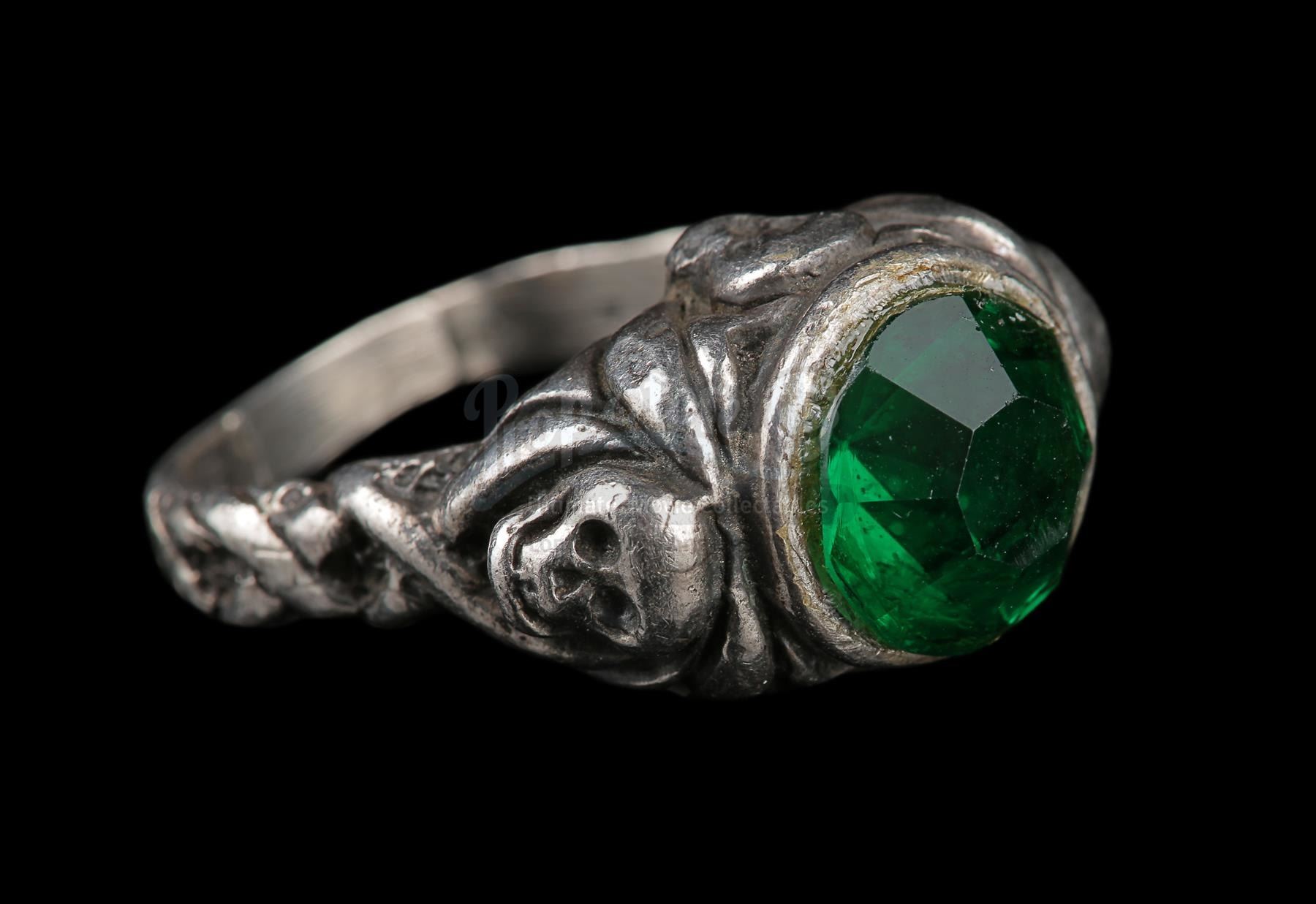 The ring is made from faux-silver metal with an inlaid green glass jewel in the centre. It features a headpiece with four cast skulls flowing into winding details down the ring's band. The piece shows production use, including the squaring off of the bottom band for a comfortable fit. Dimensions: 3.5 cm x 2.5 cm x 1.5 cm (1 1/2'' x 1'' x 3/4'')