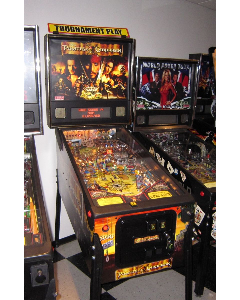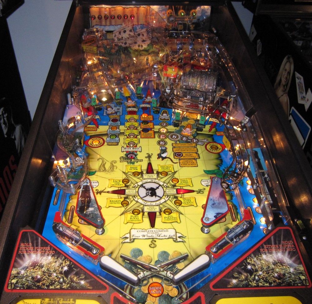 Pirates of the Caribbean offers the following features: A mechanical pirate ship that the player strikes with the pinball. With each hit, the ship lowers its sails and eventually sinks into the playfield, thus revealing a shot into the Kraken's mouth. In this area, the player can sink the ship, destroy the Kraken, and fight Davy Jones. A mechanical treasures chest, the Dead Man's Chest, through which the player can shoot the ball. When the player has the KEY, the chest opens. They can then spell H-E-A-R-T to begin HEART multi-ball. A contained spinning rubber disk where the player can capture up to three pinballs. The disk bounces them around in the contained area and holds them for an extended period of time till the player starts multi-ball. The disk sometimes represents Tortuga and other times Port Royal. A map compass comprised of playfield inserts that shows the player each feature they need to finish. Complete all eight features and play Four Winds Multi-ball. This pinball has only been used in a home since new.