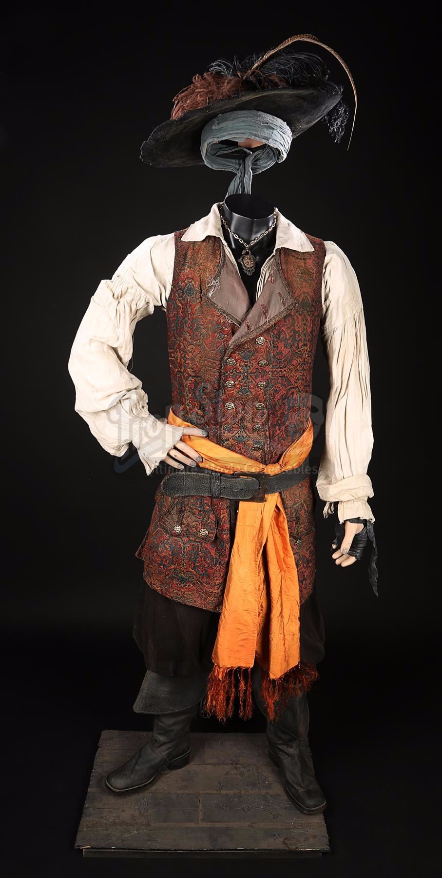 Accessories include a rubber stunt flintlock pistol; a leather baldric and sheath with faux-silver metal buckles; a metal pendant with ornate serpent designs on a metal chain; a leather fingerless glove; and a green bandana. An orange fabric sash and a replica sword have been added to complete the look of the costume, which is also accompanied by several costumier tags and Walt Disney Company certificates of authenticity.