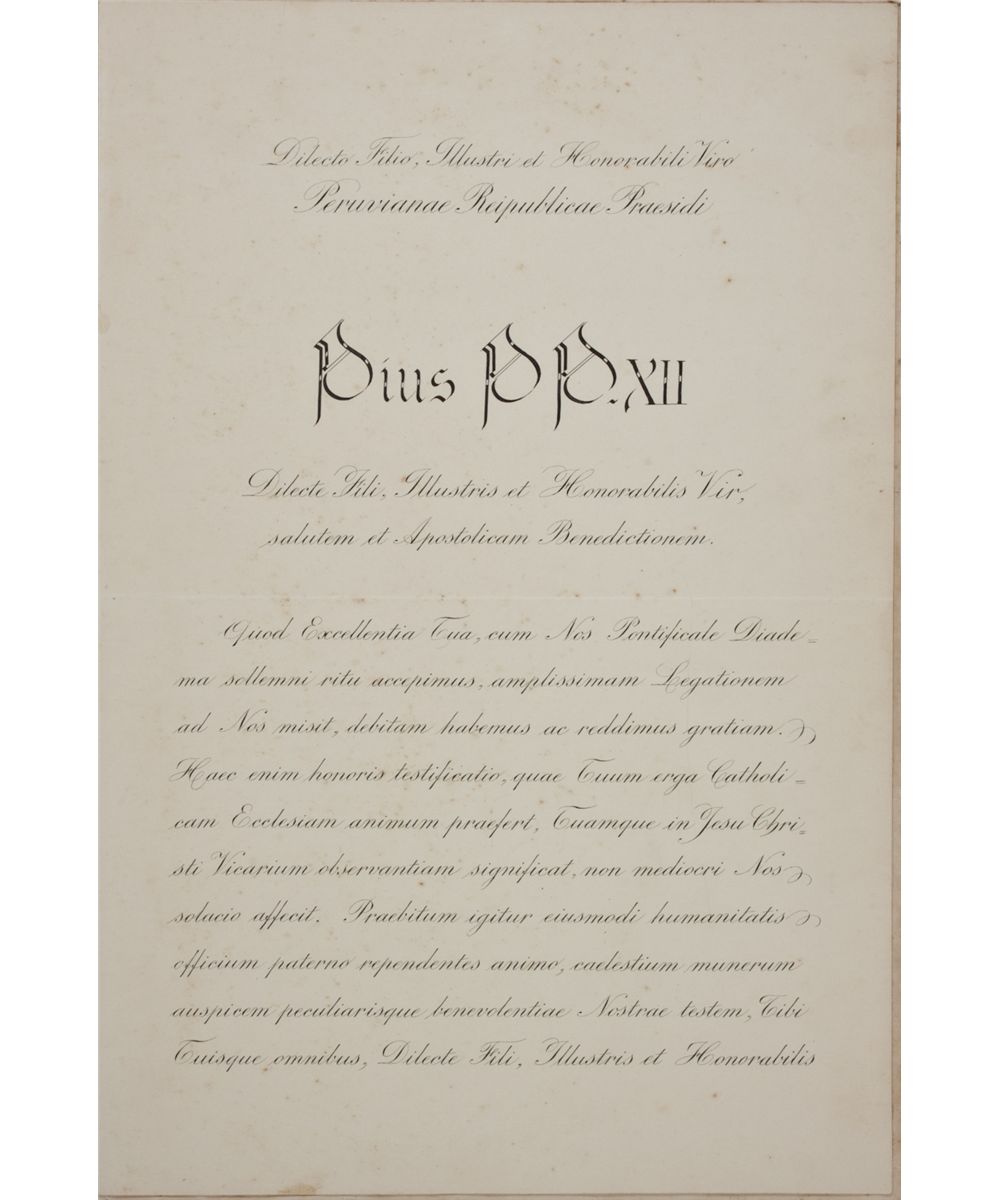 (1876 - 1958) Pope who maintained neutrality in World War II, opposed Catholic collaboration with the Communists and maintained traditional Catholic social doctrine. L.S. "PIUS P.P. XII" as Pope, 2pp. folio, Rome, Mar. 25, 1939, in Latin, a letter of state to the President of Peru. Light scattered foxing, usual folds, blank leaf mounted to a larger sheet, else very good.
