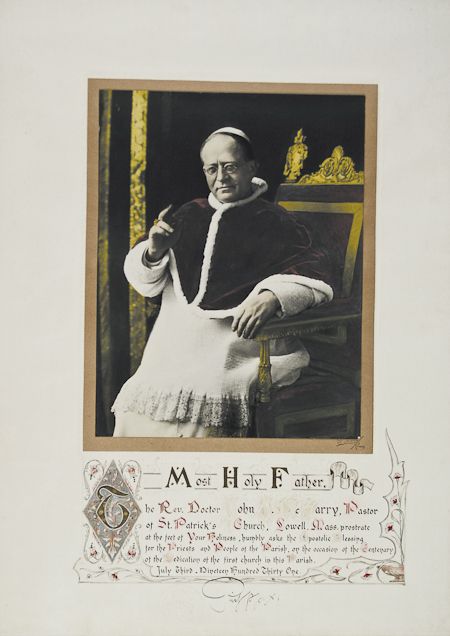 AMBROGIO DAMIANI ACHILLE RATI (1857 - 1939), Pope (1922-1939), signed the Laternan Treaty with Mussolini in 1929 establishing Vatican City, later denounced anti-Semitism, Communism and Nazism in encyclicals. Extraordinarily attractive hand-painted and calligraphied D.S. "Pius PP XI" as Pope, 1p. 18" x 26", Vatican City, July 3, 1931, a papal blessing rendered unto one Dr. Jon Carry of St. Patrick's Church in Lowell, Mass. At center is a hand-colored portrait of the Pope, and blind-embossed seal at bottom. Photograph is detached a bit, requiring re-affixing to document, else very good condition.