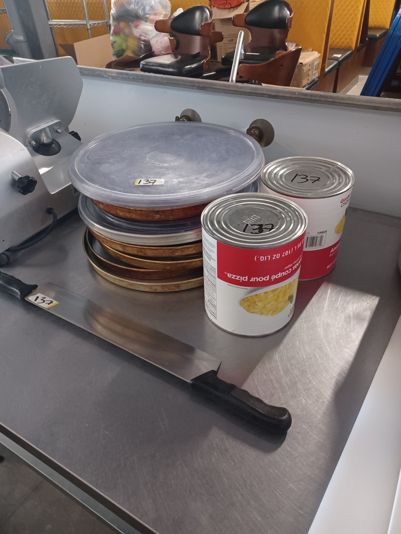 PIZZA LOT: ASSORTED PIZZA PAN(S)≈8" & PIZZA KNIFE & 2-CANS: PINEAPPLE