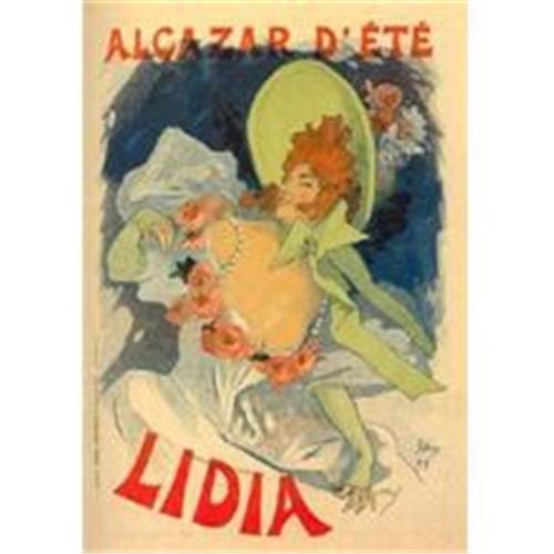 "Using only her last name Lily de Lidia graced some of the most popular music-hall stages of the day with her 'gommeuse' (double-jointed) act. This poster announces Lidia's appearance at the outdoor Alcazar d'Ete. Cheret depicts the artiste?in a half-length view that's rare for him. Her expression is winsome, the creamy expanse of her decolletage appealing, and the overall design full of movement, from the sweeping ribbons of her hat to the swaying letters of her name" (Gold p.120)