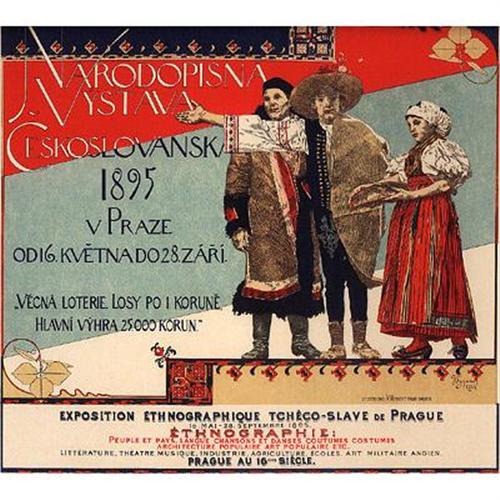 The detail of the three lifelike figures, clad in traditional Czech clothing, is striking. Combined with the elaborate patterned Czech designs, along the top and bottom, creates a wonderfully interesting poster. It beckons us to follow the outstretched hand of the caped central figure, to attend this exposition in the summer of 1895.