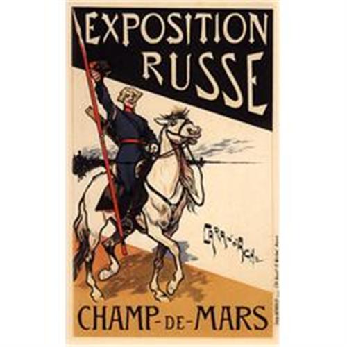 'Caran d'Ache' was the pseudonym of Emmanuel Poire. Originally born in Russia, he used the Russian word for pencil 'karandásh' as his 'nom de plume'. He became a renowned caricaturist and illustrator who excelled in military subjects. He contributed to numerous publications including Le Rire. His wonderful bold poster for the Russian exhibition at the Champ de Mars in Paris shows a proud Russian soldier astride a magnificent marching white horse. He signals us to join him with what appears to be the entire Russian army following in tow, for as far as the eye can see.