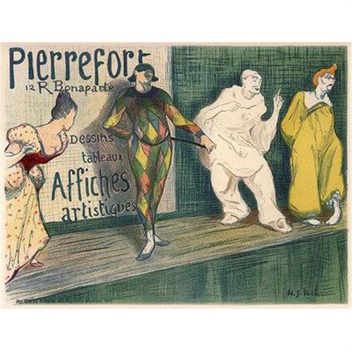 "Every poster collector should own one poster relating in some way to posters. This is one of the best and most important. Pierrefort was one of many dealers involved in posters in the 1890s (along with Sagot, Arnouls and Kleinmann) and he commissioned posters for his shop from Lobel, De Feure and Thiriet, as well as Ibels. We get a pantomime scene, with harlequin, singer, clowns, all delicately drawn, with priceless expressions"