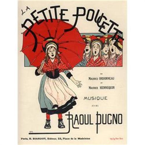 His delightful poster for the operetta "La Petite Poucette," translates to " Little Miss Hop-o'-My-Thumb." Using a large red umbrella, as the centrepiece, held aloft by a sweet singing little girl with red scarf and red socks, set against another half dozen singing little girls each with shawl and red bow, Monvel creates a delightful composition. The dancing typeface of the title "La Petite Poucette" seems to flow from the chorus of the girl's voices. Even the name of the music composer "Raoul Pugno" in it's almost avant garde style, becomes part of the composition. </font>