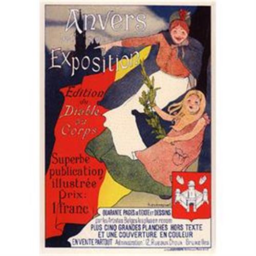 The text reads "Antwerp and its Exhibition, a diable au corps (Devil in the Flesh) publication, superb illustrated volume?drawings by the most renown Belgian artists.