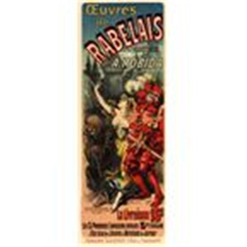 "The illustrated works of Rabelais are being offered here at 15 centimes apiece. To tempt the reader, Cheret supplies a lusty figure, with a sword strapped over his generous stomach, marching down the road in the company of a fulsome woman. A friar by the side of the road looks on with amusement at their hedonism. Small text on the lower left tells us 'It's better to write about laughter than tears' and admonishes us to live happily. Sagot, in his 1891 catalogue, sold most of Cheret's posters for three to five francs each; this image, however, had a selling price of 20 francs. It was rare even then, and Sagot declared it to be 'a superb poster, one of (Cheret's) most beautiful"(Rennert, PAI-XXIV, 240)