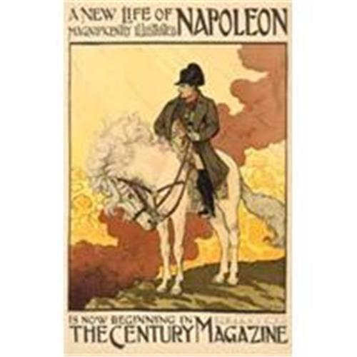 "When Century magazine serialised an illustrated Life of Napoleon in 1893, Grasset was commissioned to design a poster to launch the series. He produced a splendid poster of Napoleon at Austerlitz, the Emperor shown astride a white horse, its mane flying as it tosses its head and waves an extraordinary tail. As the equestrian figure stands on a promontory, the background is bisected by a formal pattern of stylized clouds. The poster created something of a sensation in the United States?"(Berthon & Grasset p.27)
