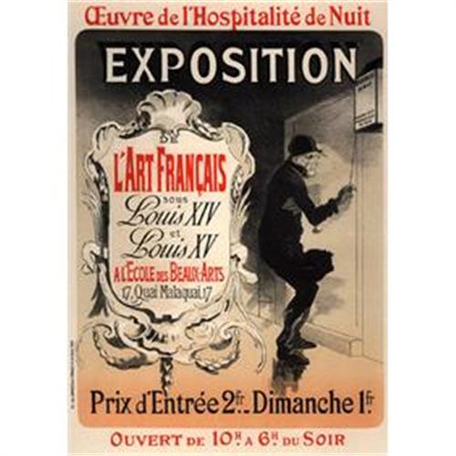 On a cold blistery night, a dark destitute figure of a man rings the night bell of an Emergency Night Shelter. Using only blacks, greys and a slight red, Cheret creates a moody design for a Charity to benefit the night shelters. It announces an exhibition of French Art from the period of Louis XIV and Louis XV at the Ecoles des Beaux-Arts. This poster is in stark contrast to the bright dancing beauties we expect from Cheret. Not unlike another deeply moving design of his (see PL. 89).