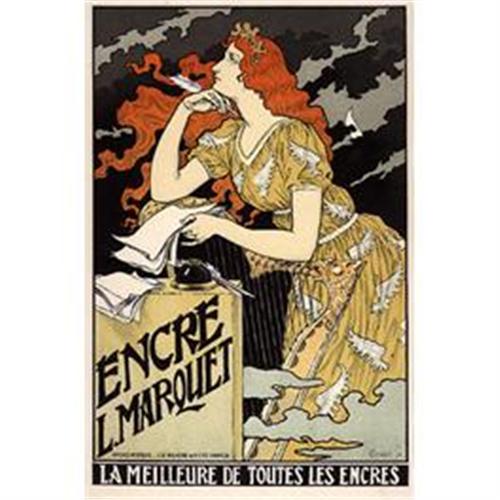 "Quill pen in hand, the pensive young woman is looking for inspiration to write something lyrical in this fine, evocative design for a writing ink. Grasset adheres to the classic mode of portraying women as serenly composed and dignified. Only the fluttering hair and scurring night clouds suggest any wild untamed thoughts"(Gold p.5)