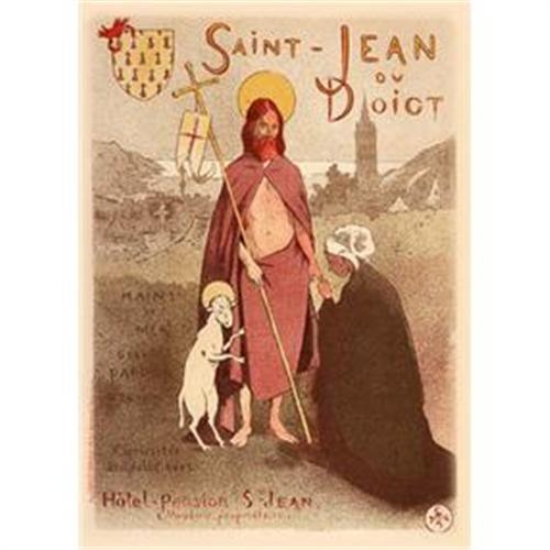This unusual travel poster by Moreau-Nelaton a leading impressionist painter, illustrator, designer and ceramicist, advertises the pardon of Saint-Jean du Doigt (St. John of the finger). The great Breton pilgrimage procession with archaeological curios and sea bathing, and most important Hotel-Pension St. Jean (Vouaux, proprietor). As with his other works, the artist uses warm pastel colours, hand lettering, and a classical renaissance treatment of the Saint and his upright haloed lamp. The overall effect is warm and inviting and speaks effectively to the pilgrims who should attend.