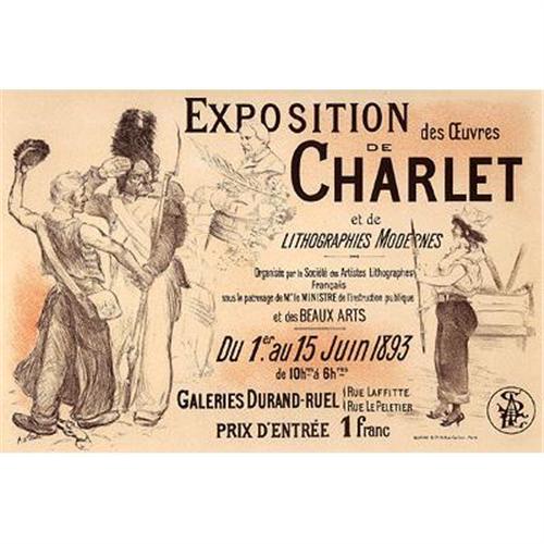 The text reads, "Exhibition of the works of the (Nicolas-Touissaint) Charlet (a Romantic-era illustrator of the Napoleonic wars) and of modern lithographs. Organized by the Society of French Lithographic Artists and sponsored by the ministry of education and fine arts?" Willete pokes fun at the artist, for whose exhibition he has designed the poster. He shows a very serious old soldier of the Napoleonic wars, saluting a young man while both are distracted by a cheeky young woman, shirt open, who mocks them. A beautifully drawn and well balanced humorous composition.