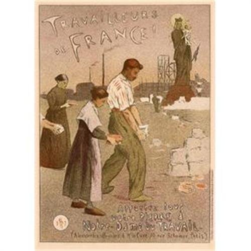 This poster for Notre Dame Cathedral by Moreau-Nelaton, a leading impressionist painter, illustrator, designer and ceramicist, advertises "French workers, bring your stone to Notre-Dame du Travail. Send your contributions to the parish Priest". Using his soft style with pastel-hues and a strongly religious tone, as with most of his work, he creates an intriguing poster showing man, woman, and child, bringing stone to the site, under the watchful eye of the mother Mary and child.