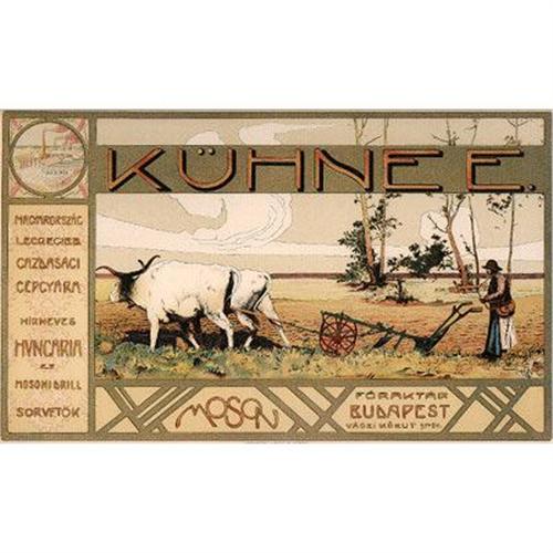 Using soft pastel tones, Basch has combined a traditional well executed farm scene, with dynamic Art nouveau border design and type style, creating a beautiful and effective poster. Note the repeated wheel sprocket design behind the text in the far left panel.The poster's text reads, "The Kuhnee company, Hungary's oldest agricultural machine works, the famous Hungária and Monosonidrill seed drills, Moson, Budapest"