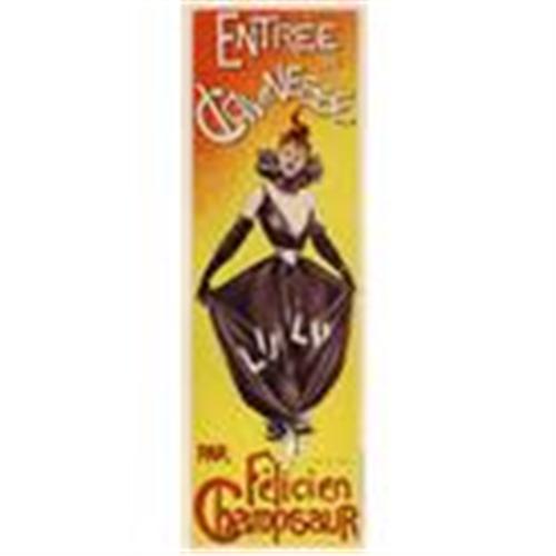 Advertising Felicien Champsaur's "Entrance of a Female Clown". Lucas, in his typical understated way, shows an alluring, elegantly dressed, red-haired lady clown, with presumably her stage name "Lu-Lu" written on her softly rendered dress. A background of vibrant orange that blends into a very striking yellow contrast with the grays of her dress, creating an effective image.