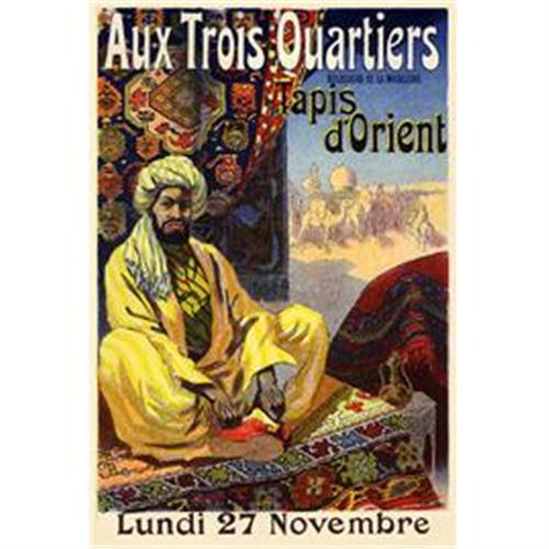 "Pean's paean to rugs, for a Paris department store. An Arab or Persian merchant sits amid his colourful wares, the caravan and mosque in the background lend further authenticity. Red and blue dominate this multi-coloured design" (Rennert PAI-XIX, 457) "Rene Pean was a pupil of Cheret, working under him at the Chaix printing firm and this piece definitely reflects the master's influence. He specialized in theatre and cabaret posters from around 1890 to 1905. After being among the first to produce posters for the fledgling movie industry, he faded into obscurity" (Rennert, PAI-XXX, 92)