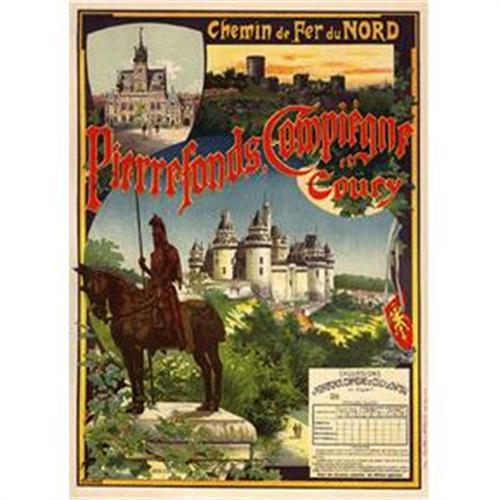 This is one of several posters by Fraipoint for the Northern Railroad Company, announcing excursions to Pierrefonds, Compiegne and Coucy-le-Château. The artist, in a pleasant painterly style, depicts the wondrous historic sights of the area. The vibrant greens of the landscape set against a brilliant blue sky, contrast well with the elegant old style type, set in red and yellow. This Brussels born artist was a painter and illustrator in Paris where he collaborated on Le Courrier Francais and other revues. He also created numerous posters, largely for the French rail.