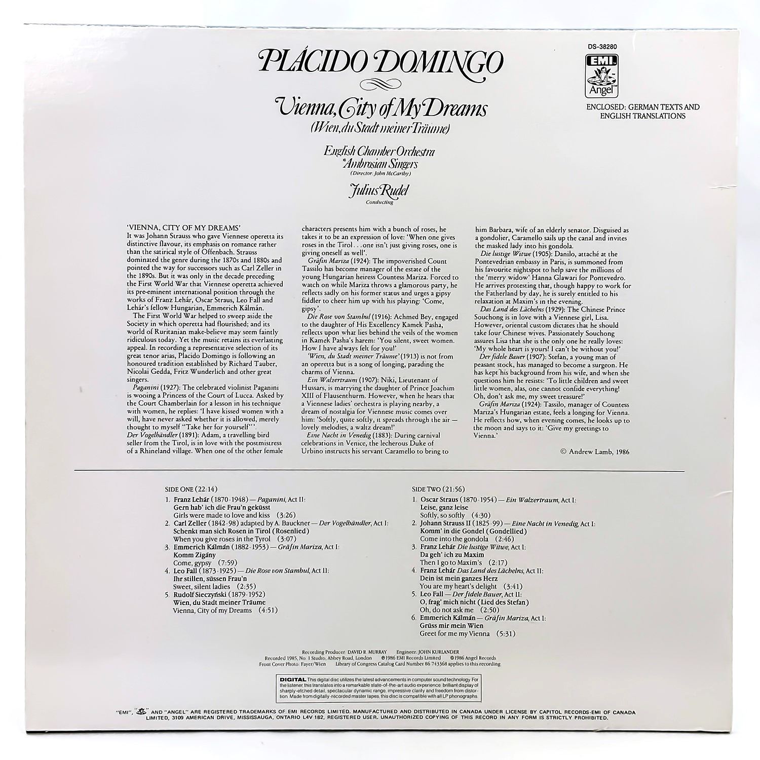 #9554 - FROM PRIVATE COLLECTION OF CLASSICAL/OPERA RECORDS. VINYL LP RECORD ALBUM. CLASSICAL, OPERATIC, ROMANTIC, ANGEL RECORDS DS-38280