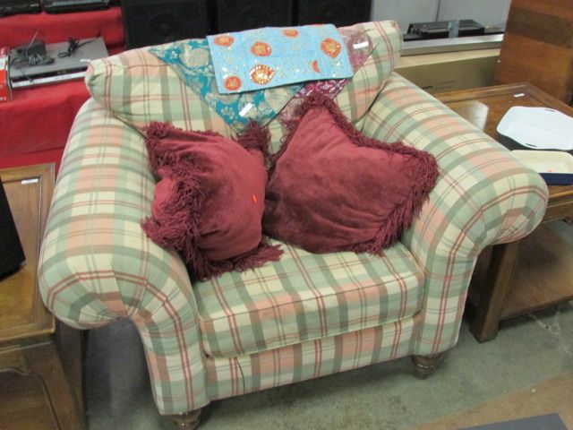 PLAID UPHOLSTERED ARM CHAIR WITH 2 BURGANY CUSHIONS