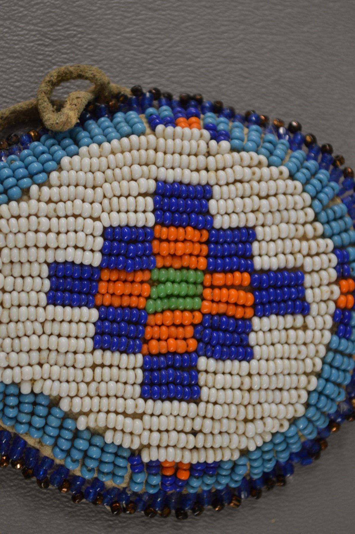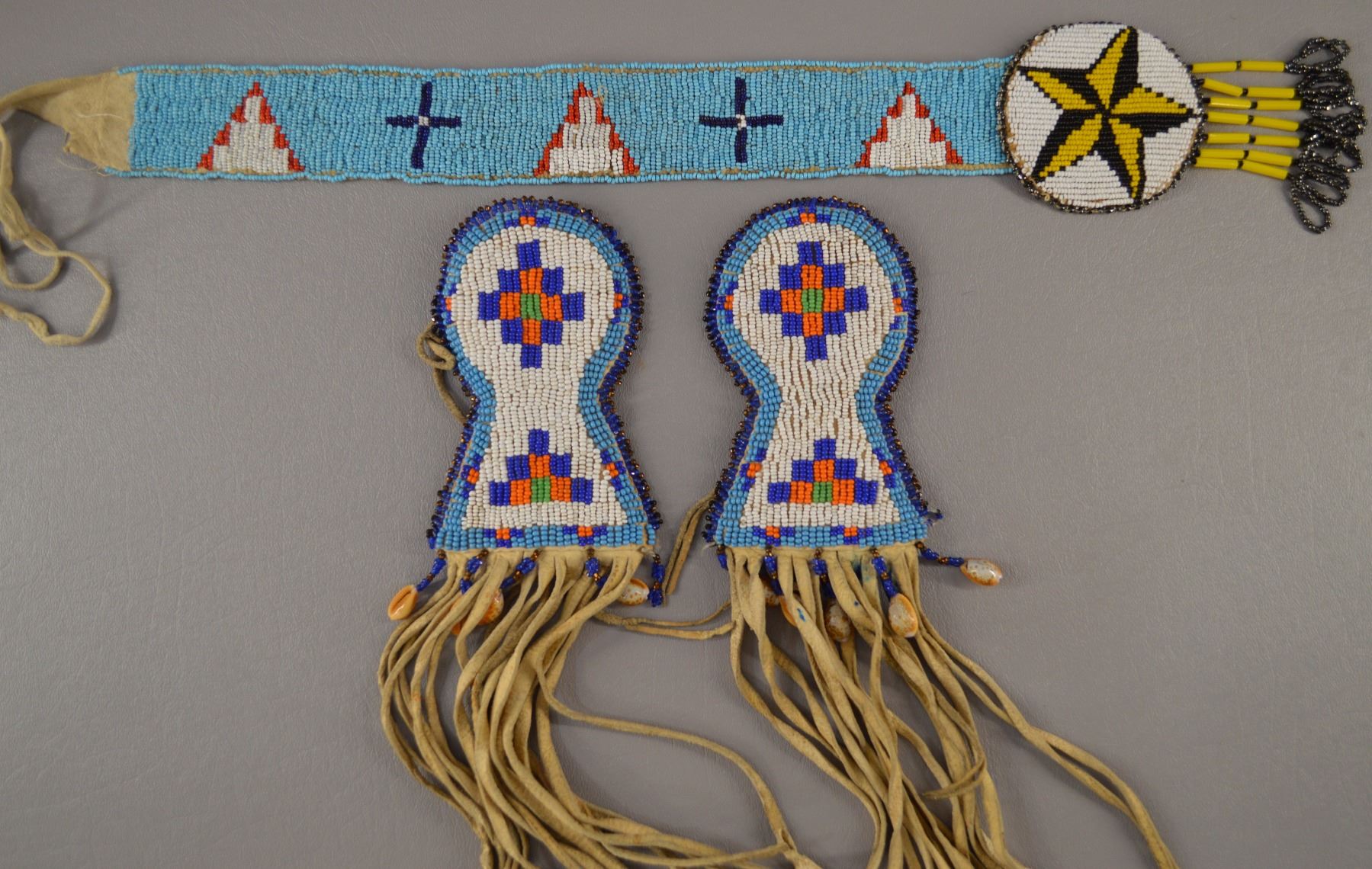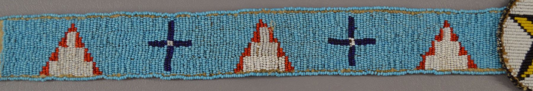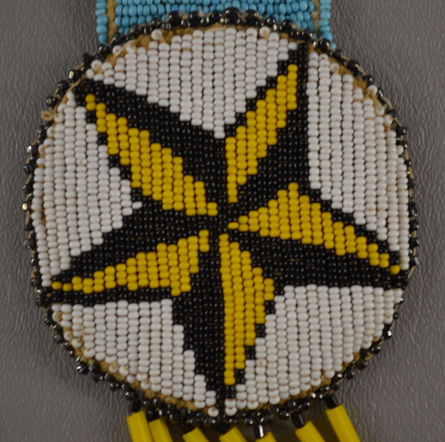 1950's. A pair of beaded Keyhole horse ornaments, 3" x 13". Nautic star 3" diameter. Beaded strip with crosses and tepees, has minor bead loss. 2" x 12.25"