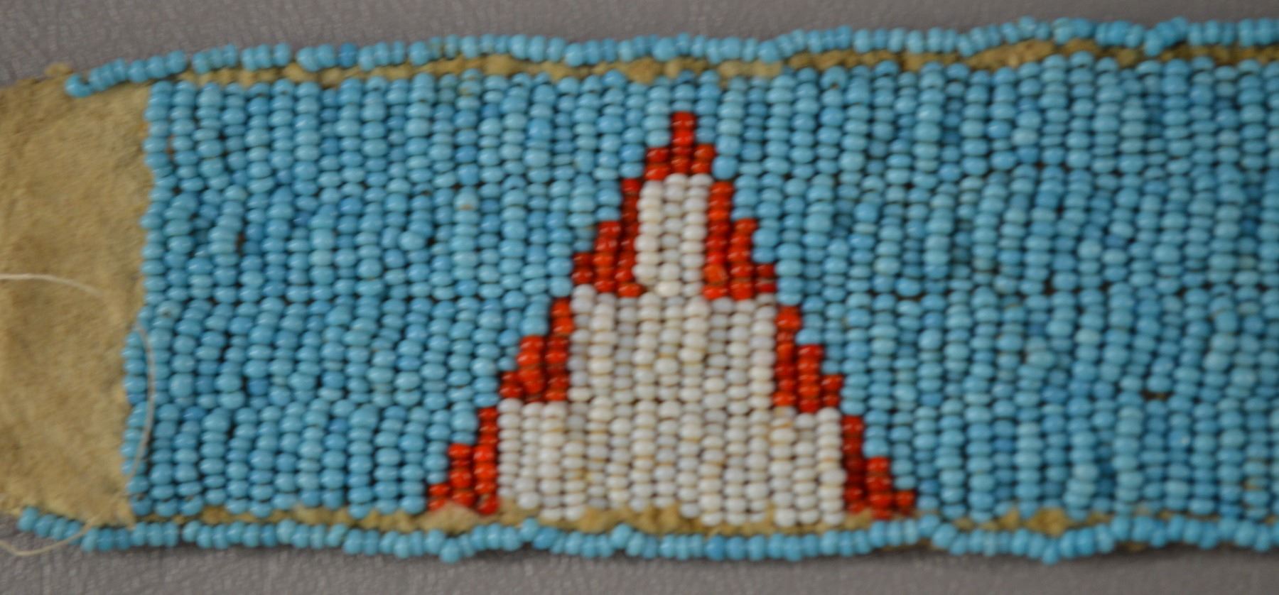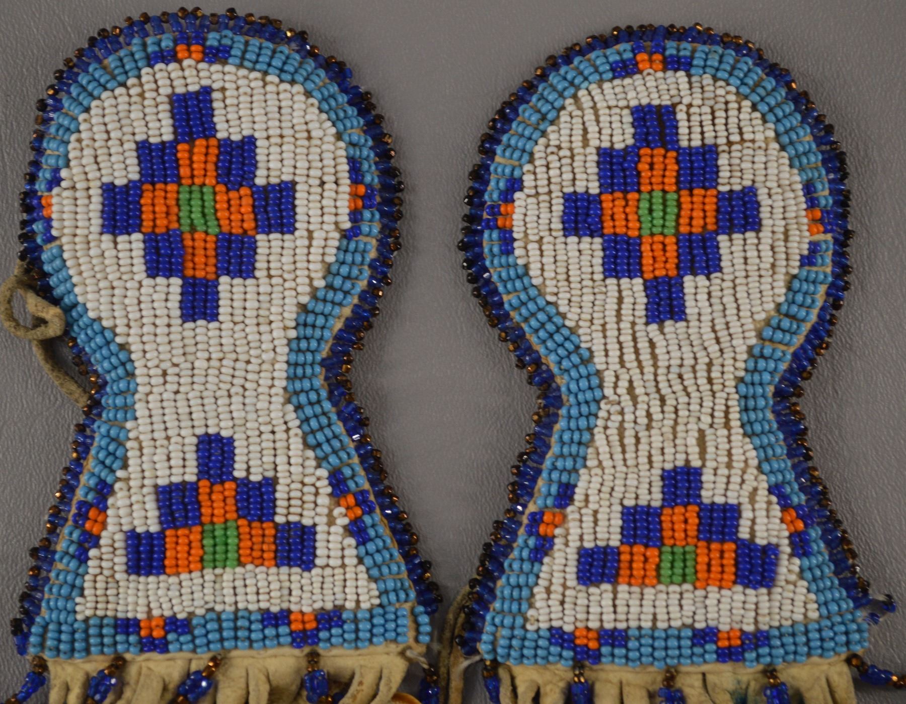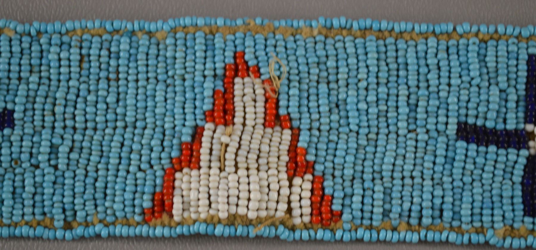 1950's. A pair of beaded Keyhole horse ornaments, 3" x 13". Nautic star 3" diameter. Beaded strip with crosses and tepees, has minor bead loss. 2" x 12.25"