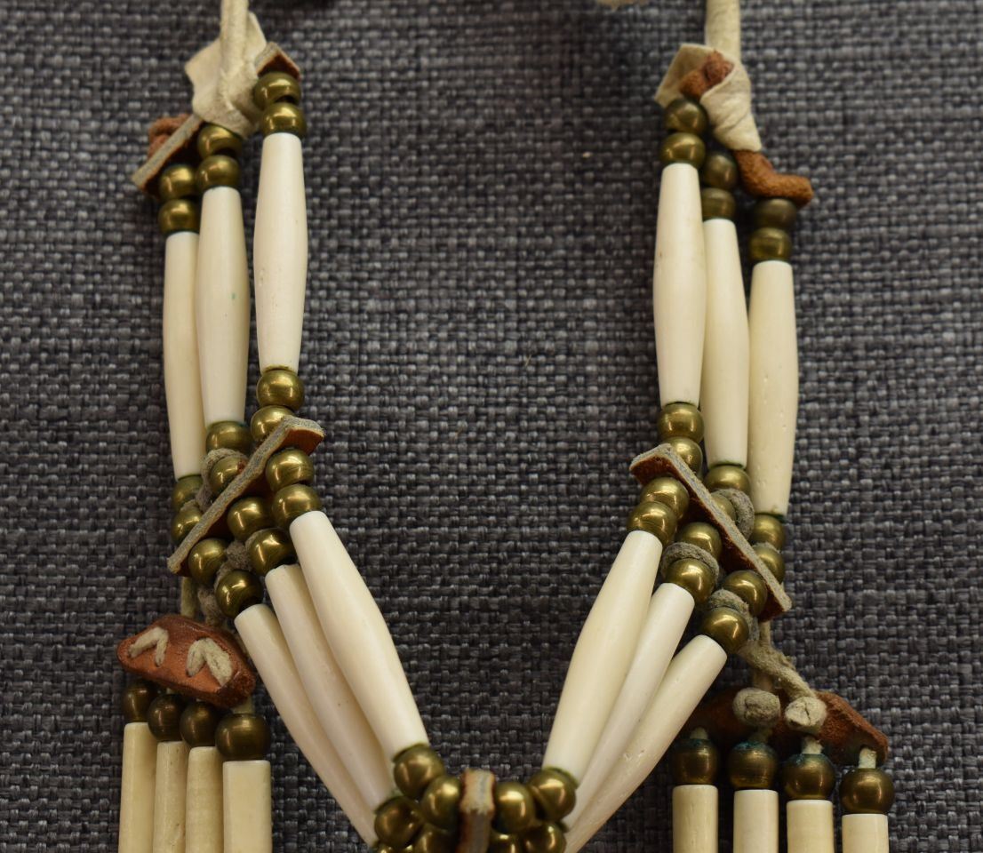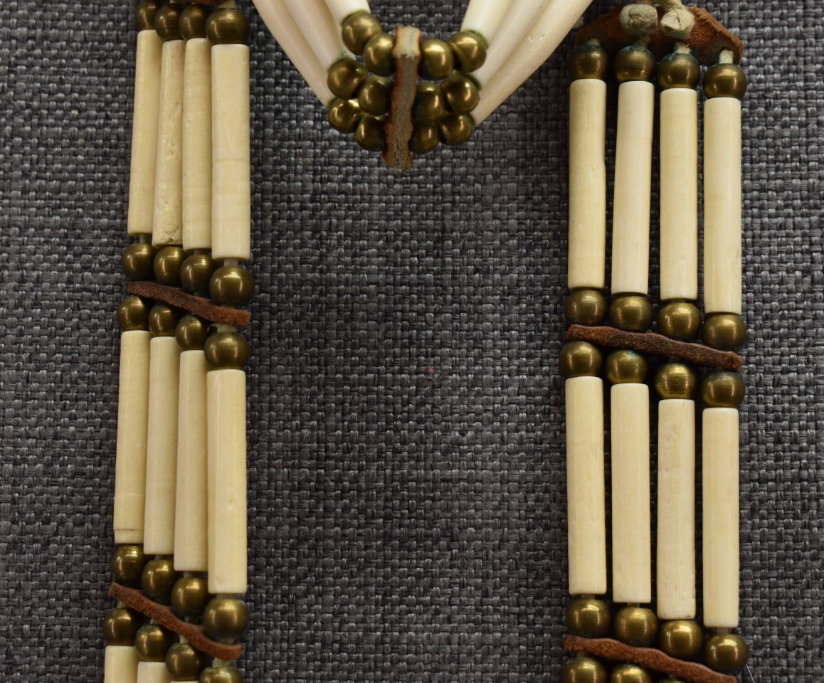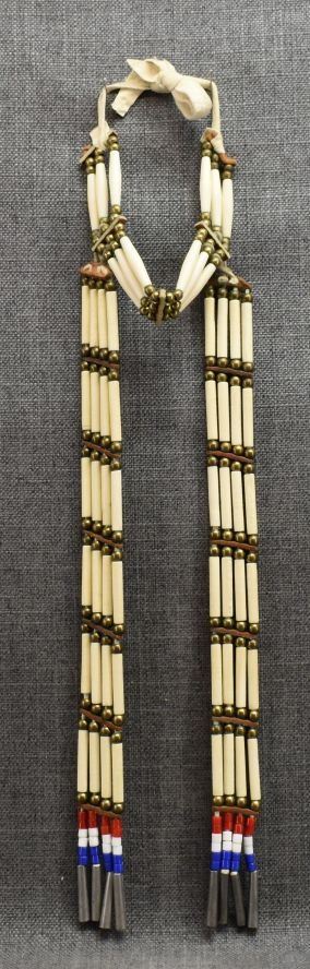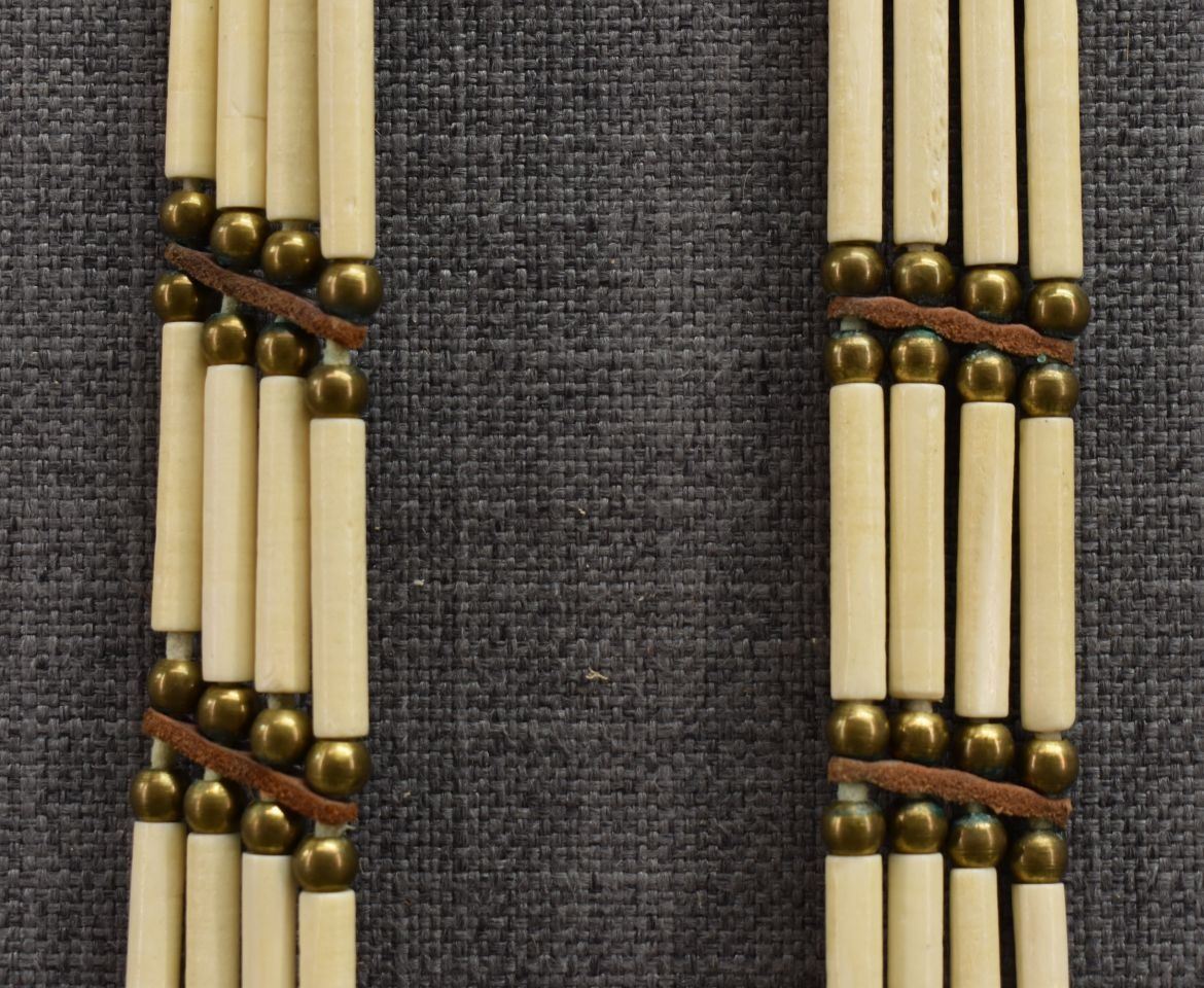 20th century plains Indian, hair pipe brass and glass beads 15" with drops 16.5" long