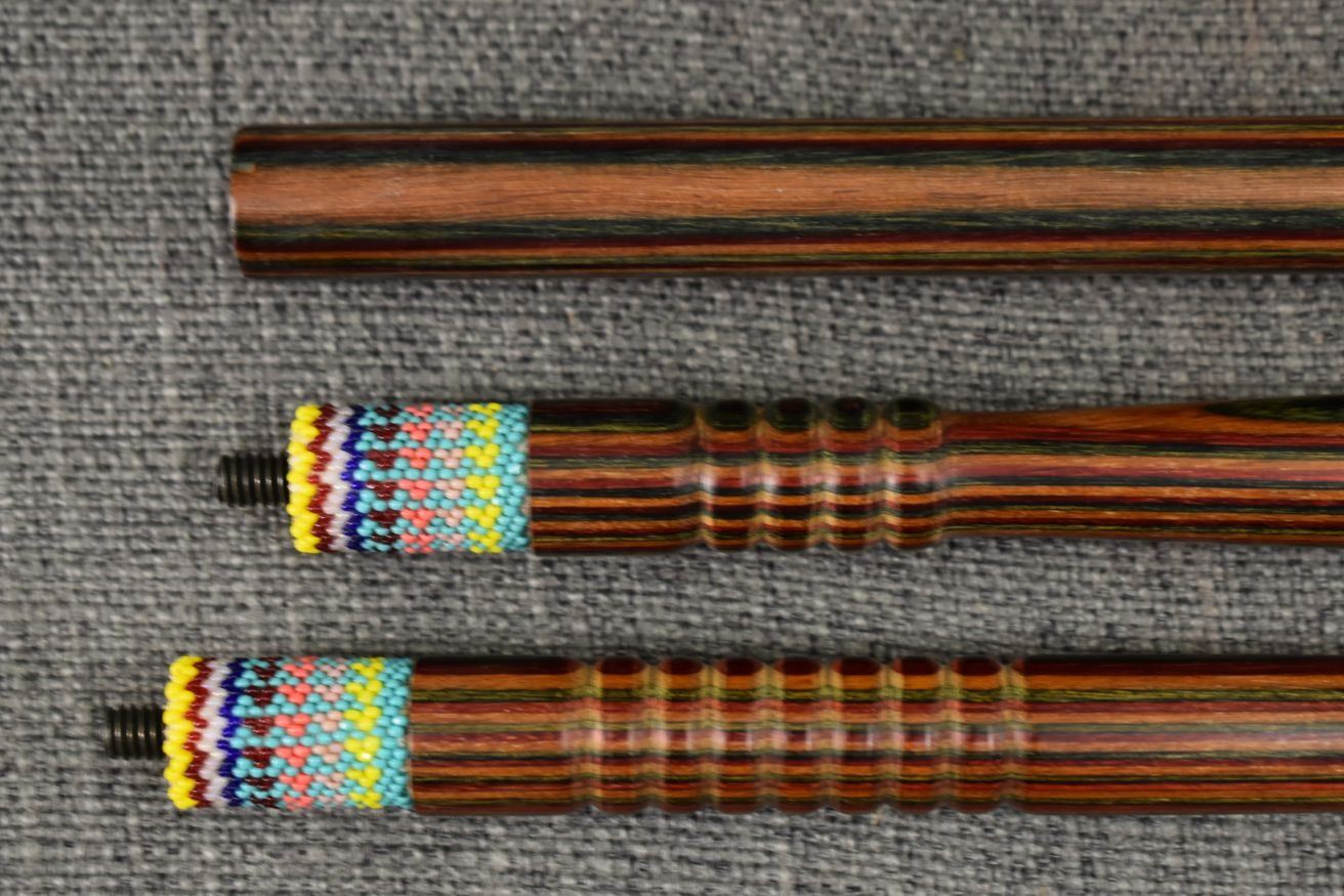 1980-90's Plains Indian, wooden peyote stick with beaded ribbon and horsehair design 41", dance stick with beaded design 17" excluding fringe 9" long