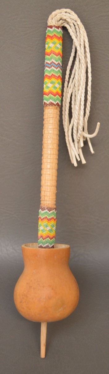 1950-60's hand carved handle with geometric beaded design, 8.5" long. Braided leather fringe 6.5". Gourd head rattle 2" x 2.75.