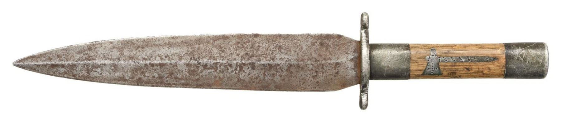 DESIGN. 13” overall, 8.25” double edged blade with medial ridge, sculpted crossguard, oval wood grip with inset tomahawk on one side, and star and Crescent moon on other, heavy lead ferrule & pommel. CONDITION: good overall. (02-21005/JS). $400-600.