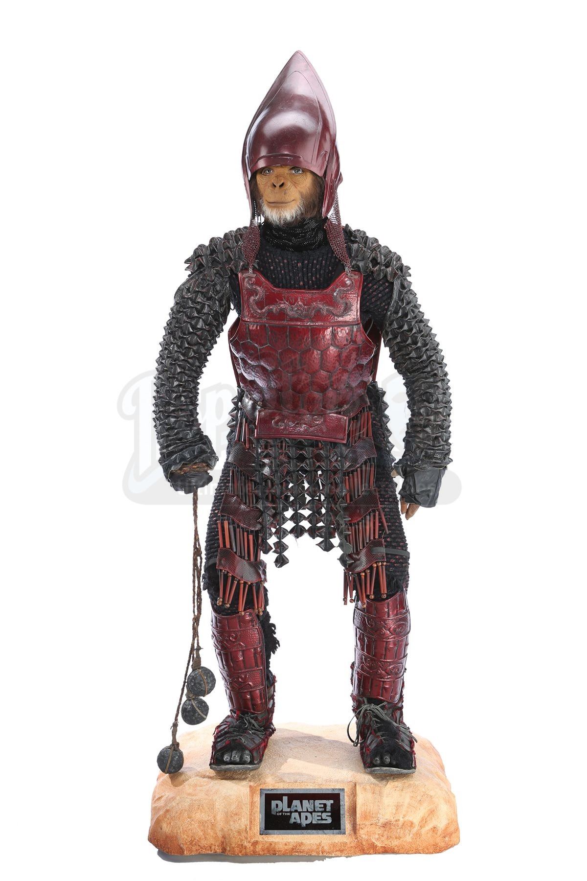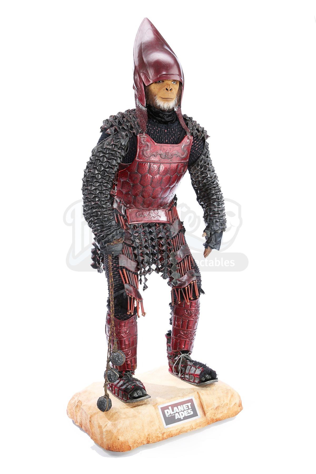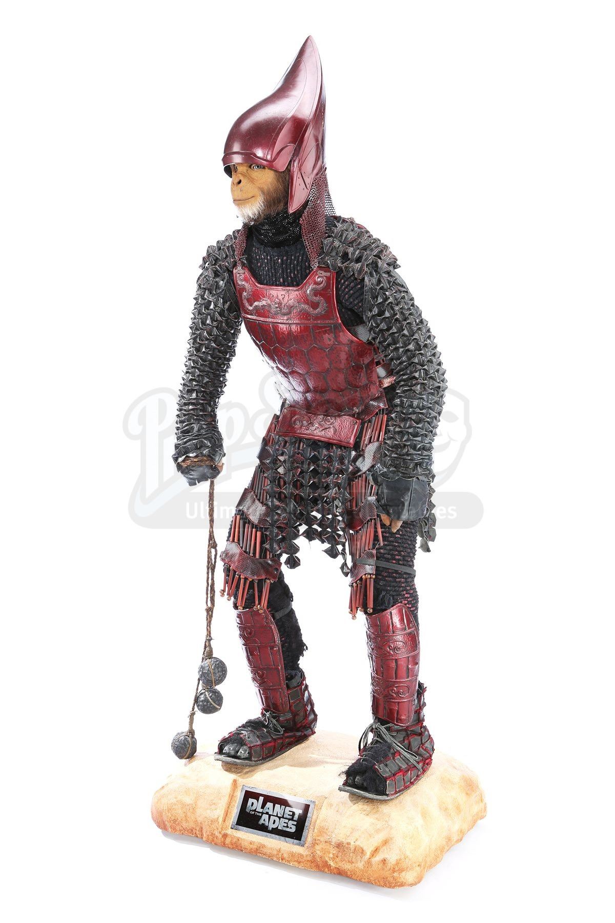 An armoured chimpanzee costume from Tim Burton’s sci-fi remake Planet of the Apes. This lot consists of a helmet, a mask, a breastplate, a sleeved leotard, a pair of chimp gloves, an armoured skirt, a pair of woollen leggings, shin guards and ape shoes, and a bolas weapon.