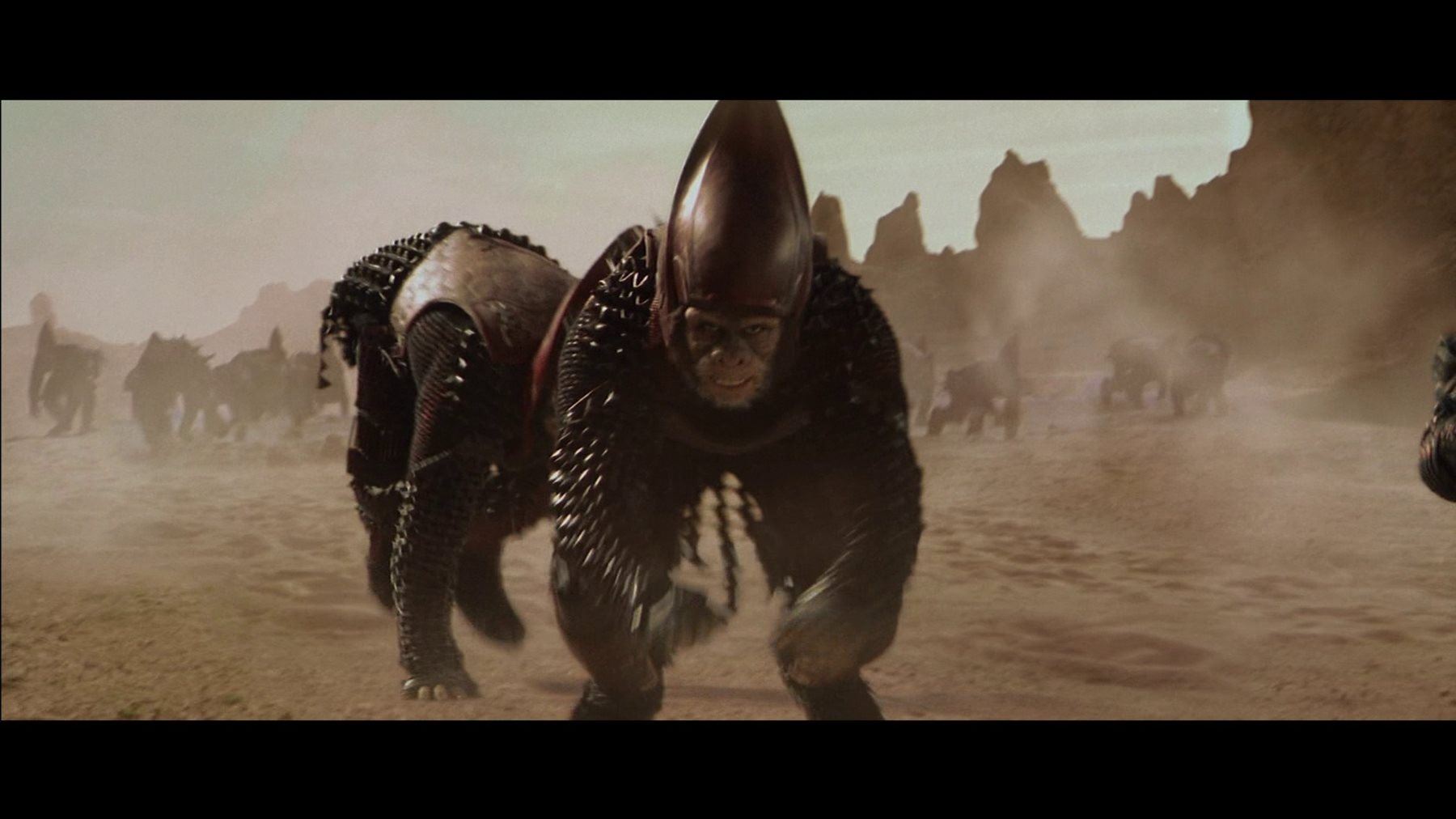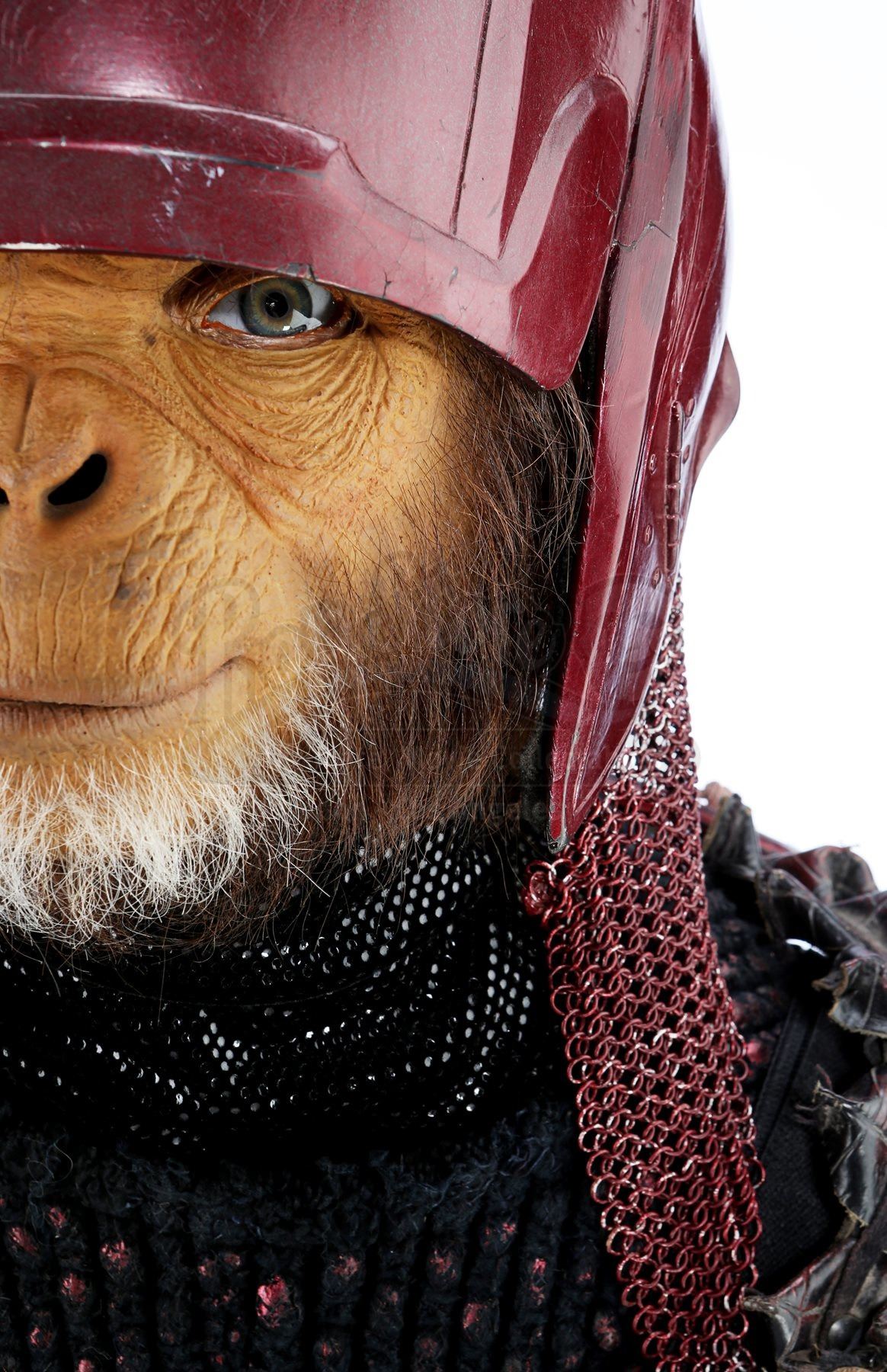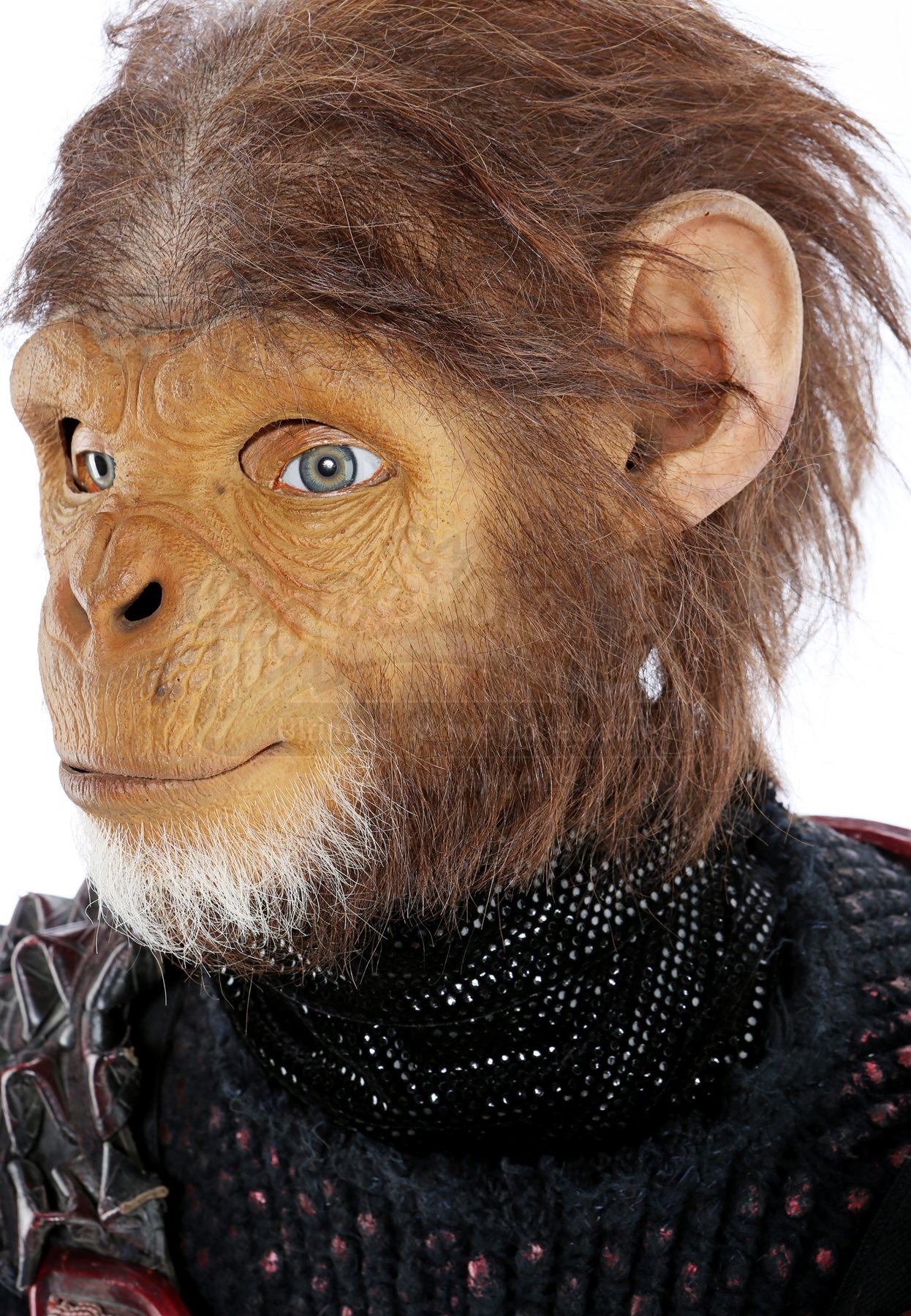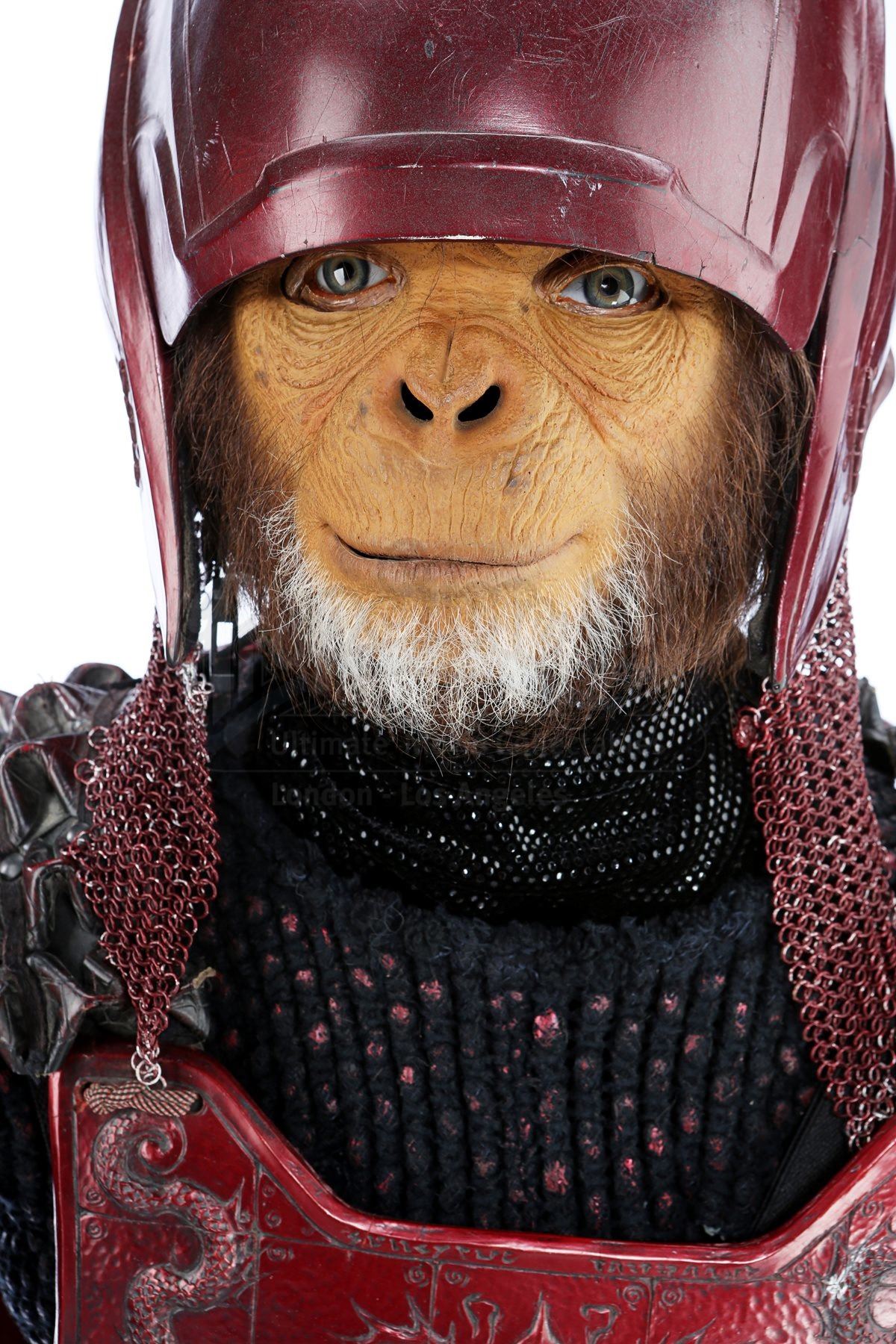 An armoured chimpanzee costume from Tim Burton’s sci-fi remake Planet of the Apes. This lot consists of a helmet, a mask, a breastplate, a sleeved leotard, a pair of chimp gloves, an armoured skirt, a pair of woollen leggings, shin guards and ape shoes, and a bolas weapon.