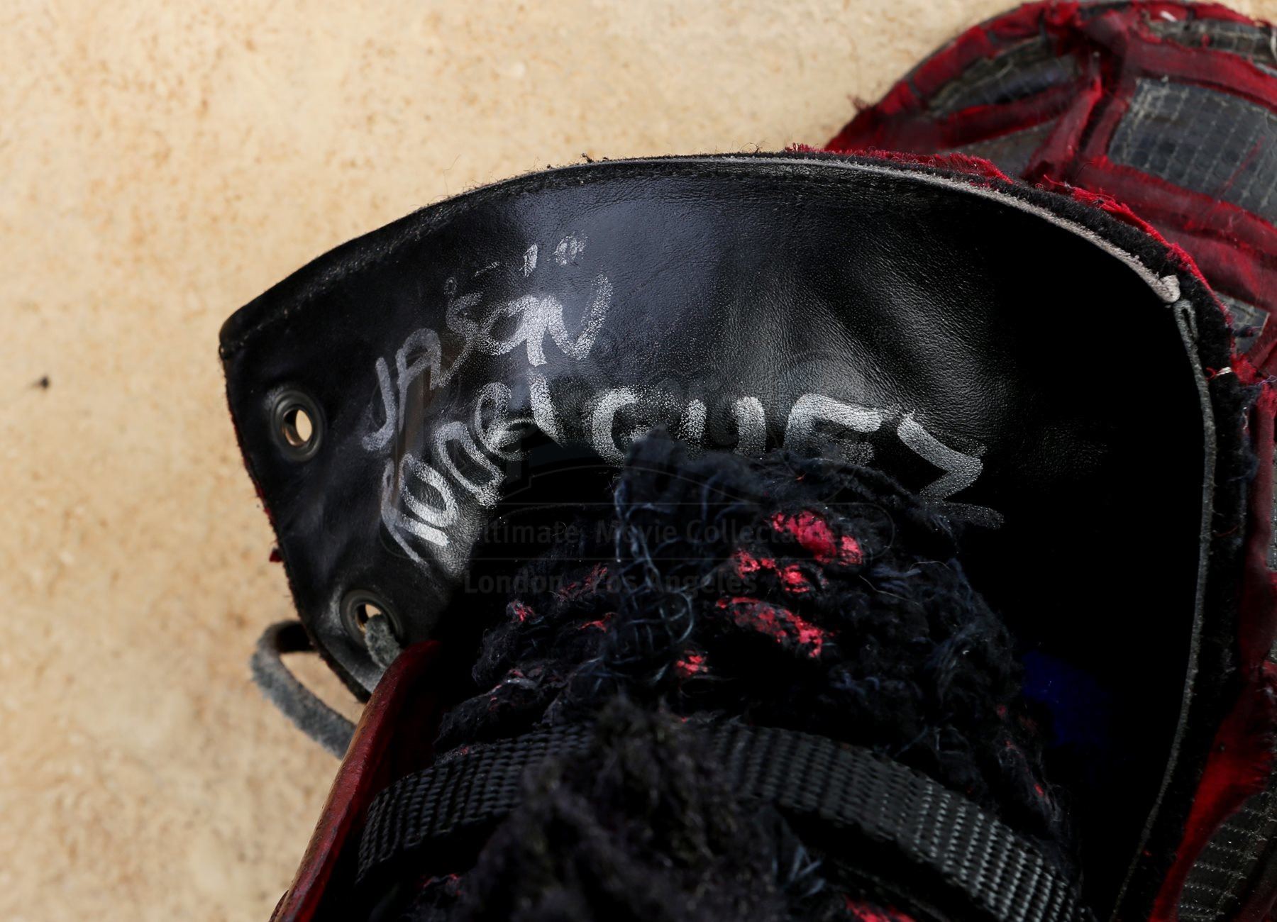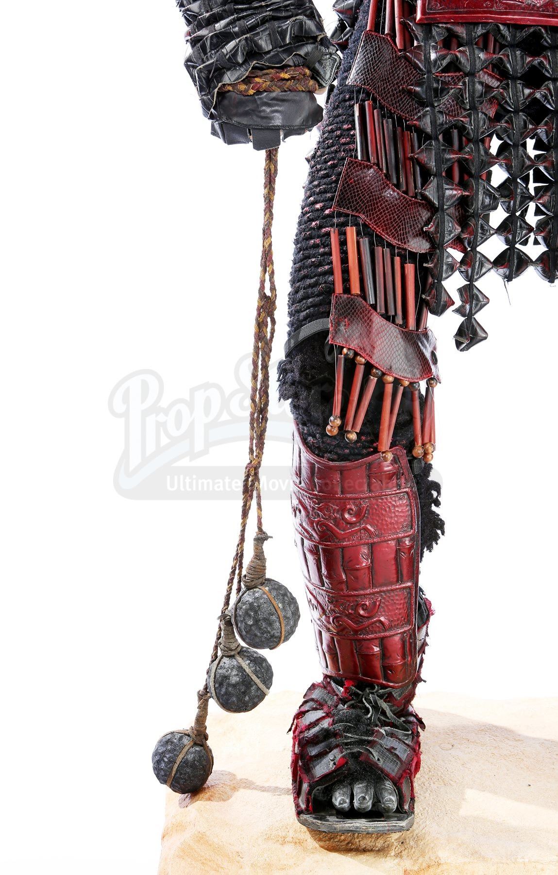 The leggings are made of wool and spandex with patches of fur stitched along the legs. The two fibreglass shin guards have depictions of apes intricately carved into their facings, while the ape shoes feature urethane toes and have fur laid over the laces. The helmet is marked “Peter Deleal” and the shoes are marked “Jason Rodriguez”. Also included is a bolas throwing weapon, which comprises three foam rocks bound with leather cords.