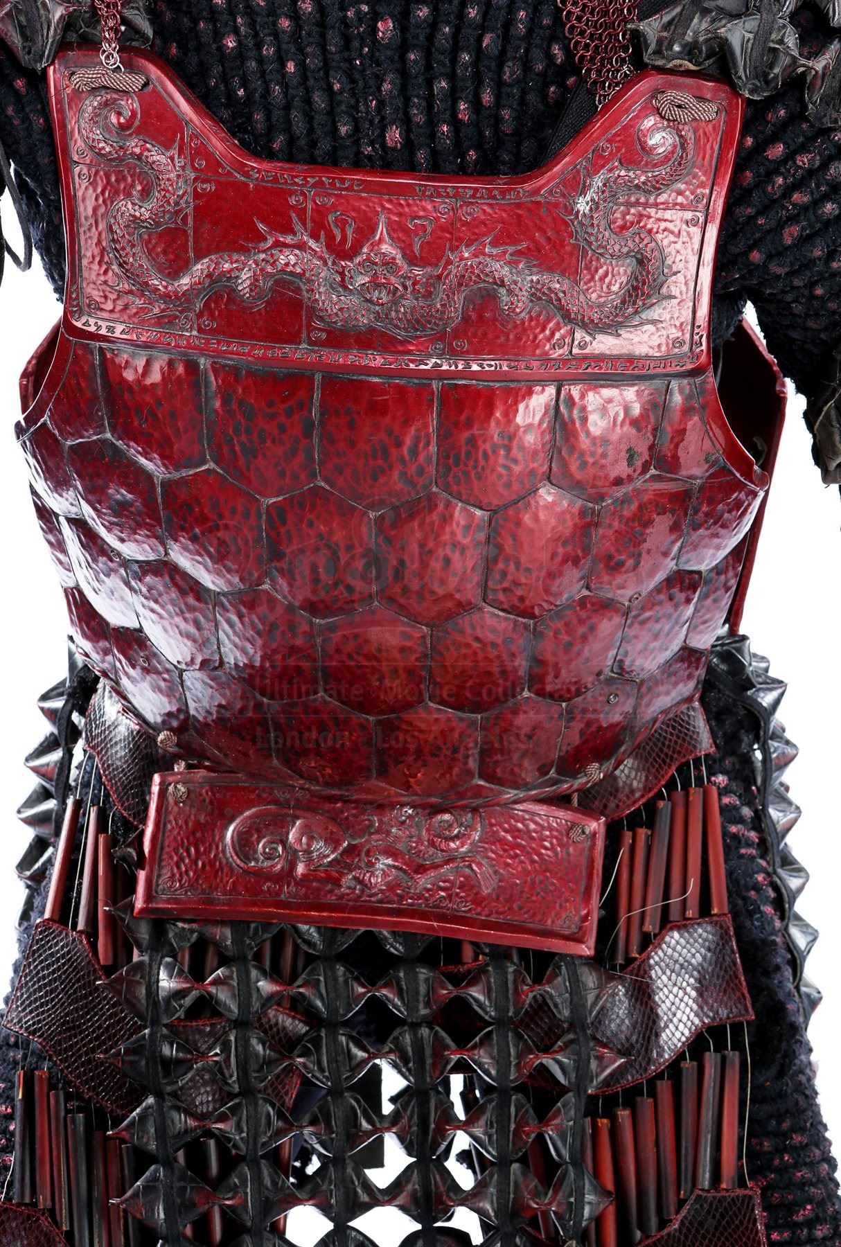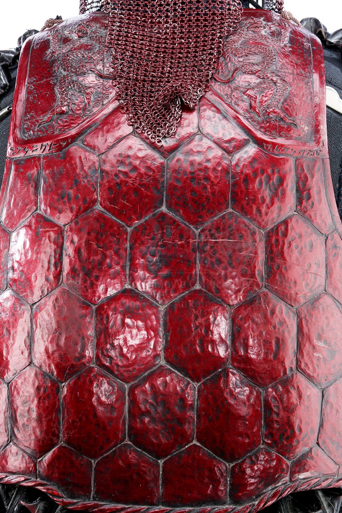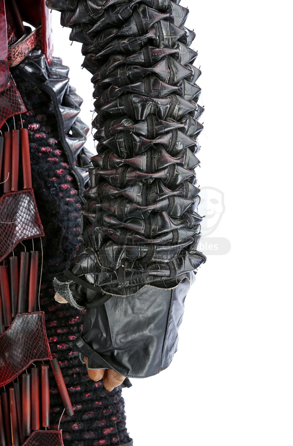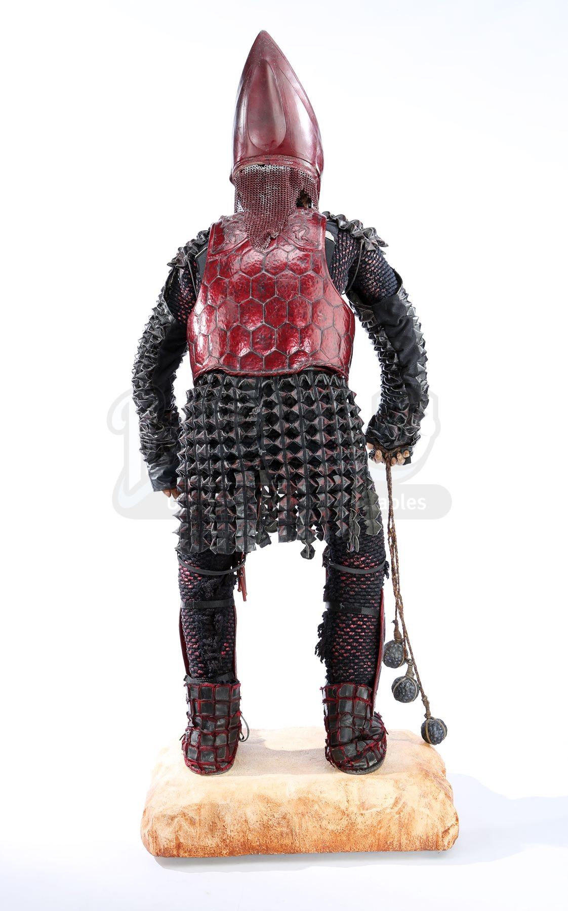 The helmet, breastplate and shin guards are made of fibreglass, with soft padding in the helmet and chainmail at the rear, to cover the neck. Included is a latex chimp mask with hand-punched faux hair and eyes made of resin and acrylic. It is attached to the mannequin (detailed below) with Velcro.