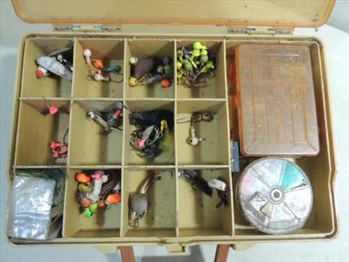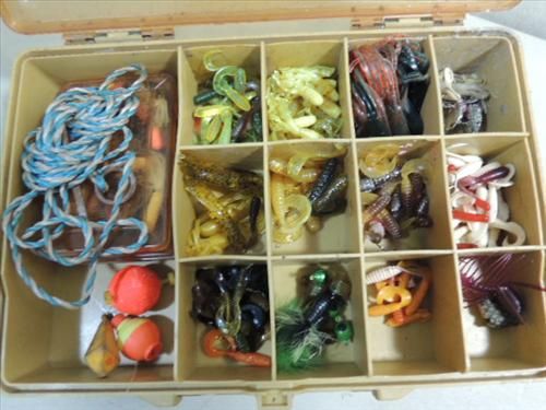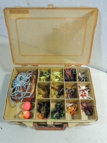 PLANO MAGNUM FISHING TACKLE BOX FULL OF SUPPLIES, WORMS, FISHING LINE AND MORE. AS SHOWN. VIEW PICTURE FOR DETAIL.