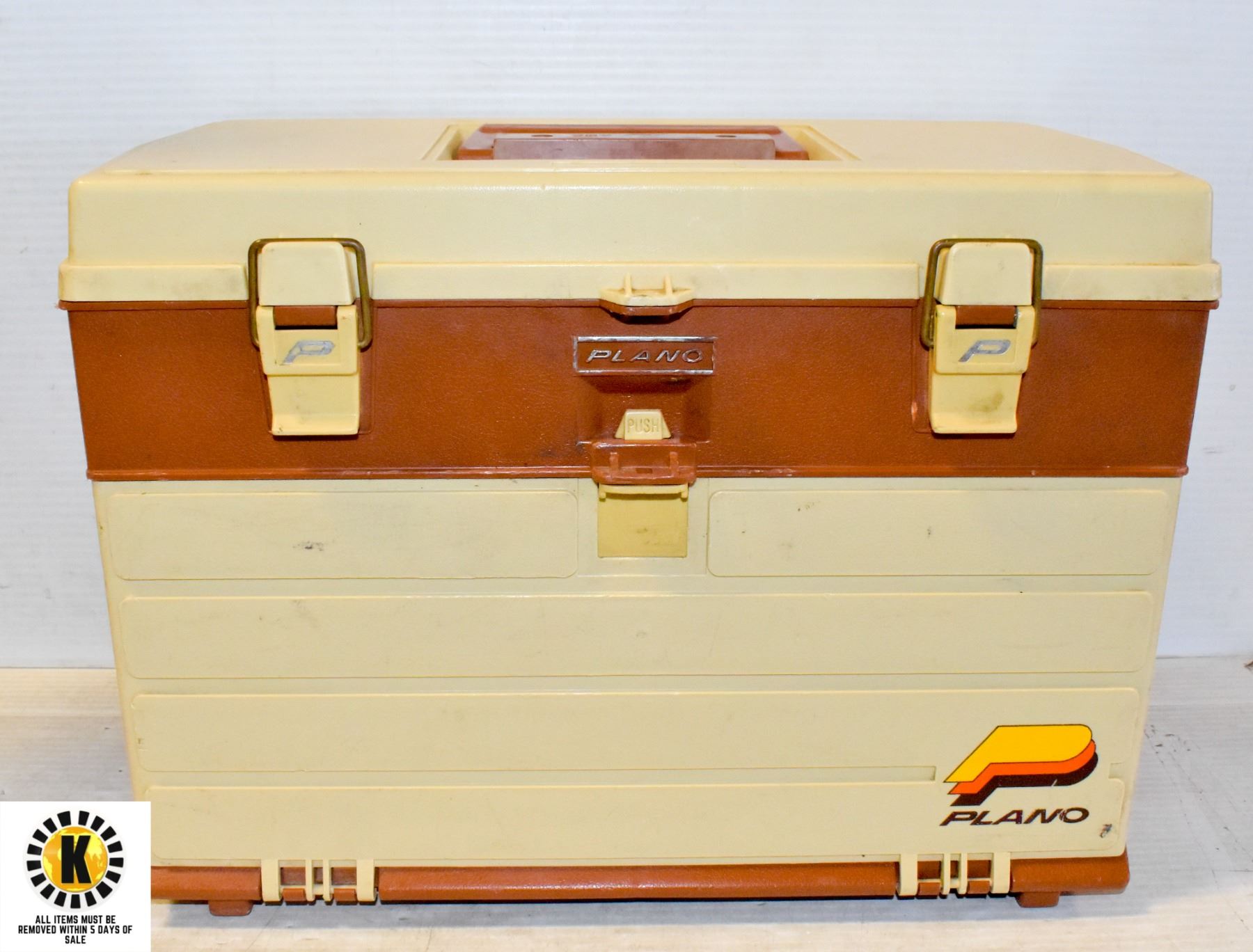 PLANO PLASTIC FISHING TACKLE BOX MODEL 757. HINGED LID 5 STORAGE AREAS