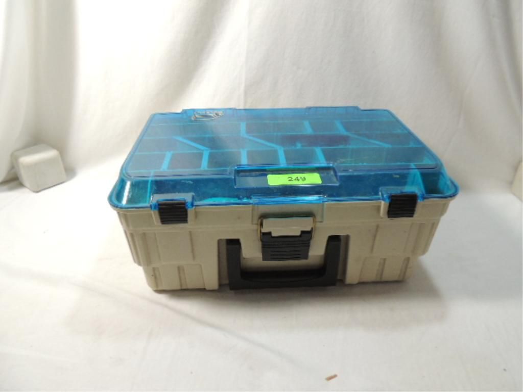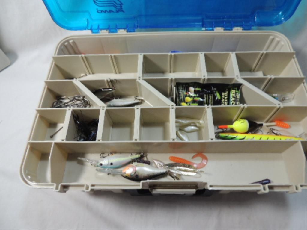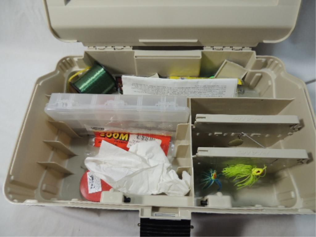 NICE TACKLE BOX WITH FISHING HOOKS, LURES, FLOATERS. AS SHOWN. SEE PHOTO FOR MORE DETAILS.