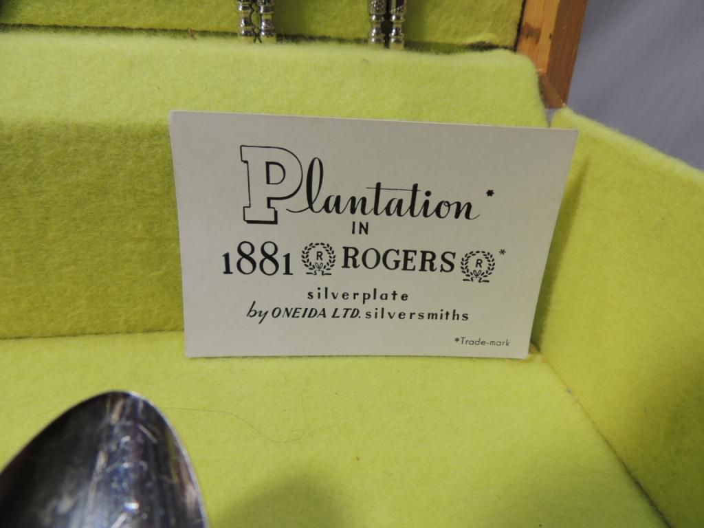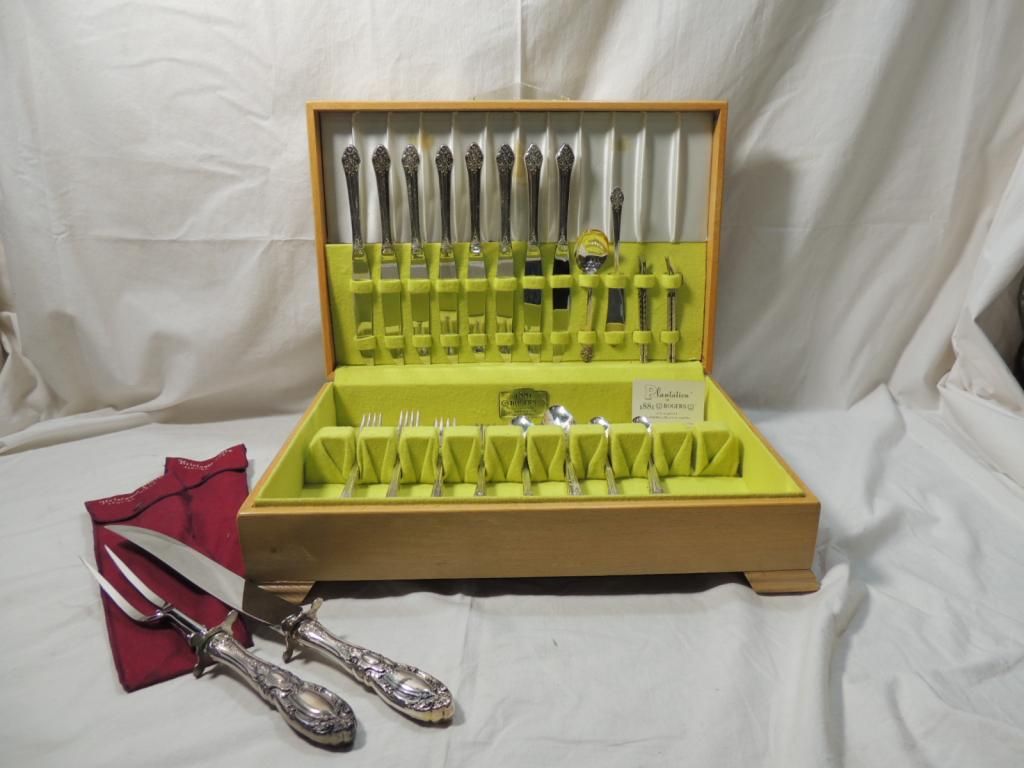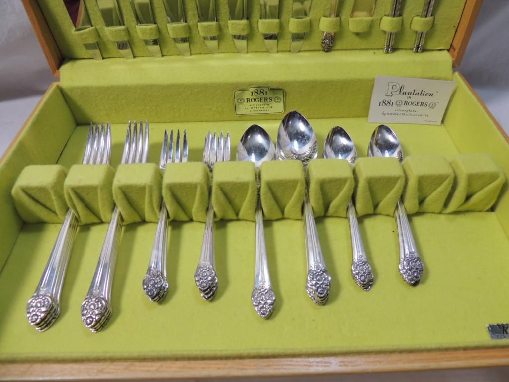 50 PIECE PLANTATION IN 1881 ROGERS SILVER PLATE BY ONEIDA SILVERSMITHS. SILVERWARE SET IN SILVERWARE CASE. SERVING PIECES INCLUDED. FULL SET FOR 4. AS SHOWN. SEE PHOTO FOR MORE DETAILS.
