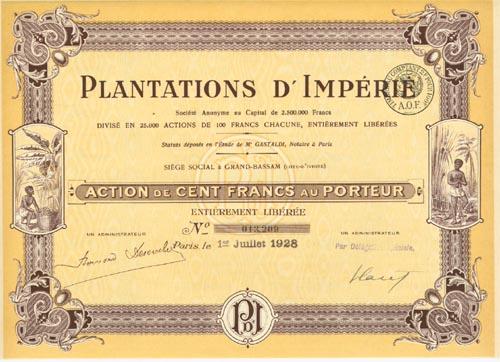 1928, Paris, France. Stock certificate. Yellow/Brown. Ornate border with two small vignettes of natives at right and left center. Very Fine.