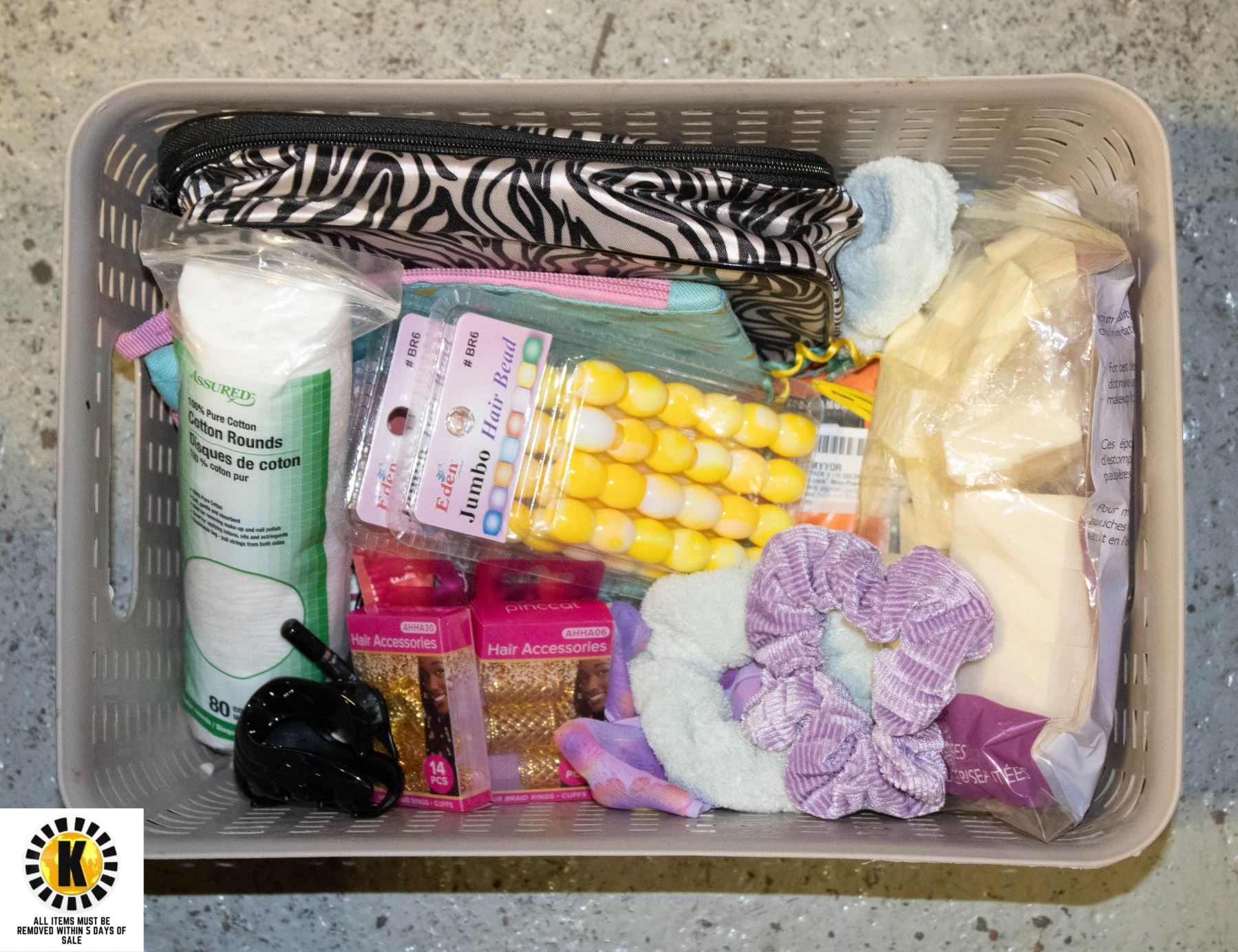 PLASTIC BROWN BASKET WITH HAIR, NAIL &