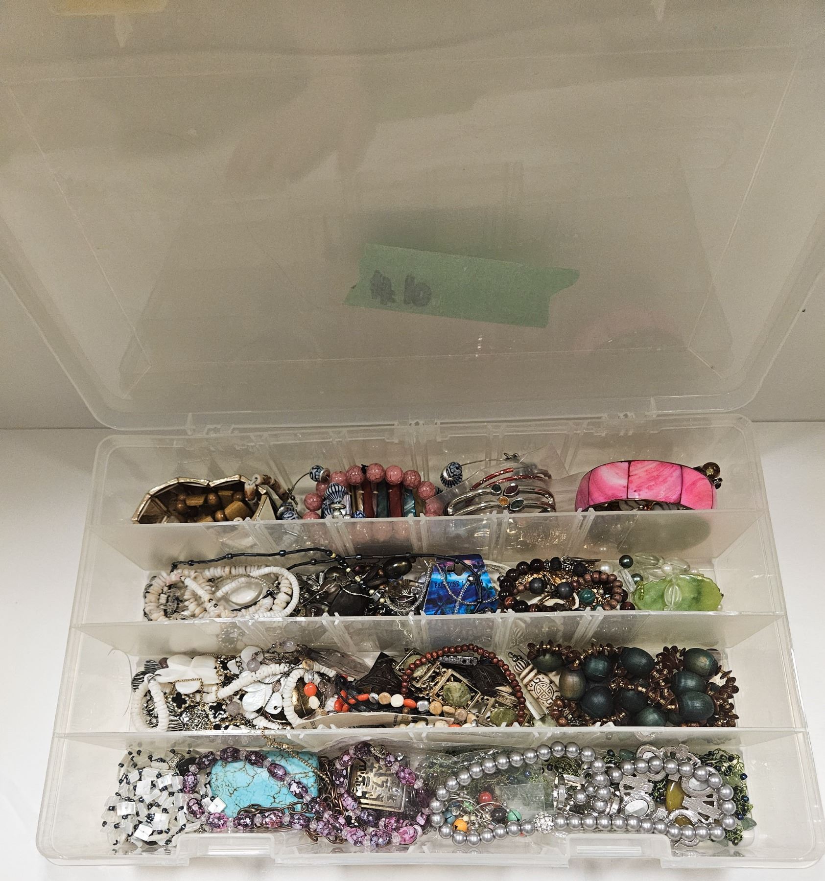 PLASTIC ORGANIZER FULL OF ASSORTED JEWELRY