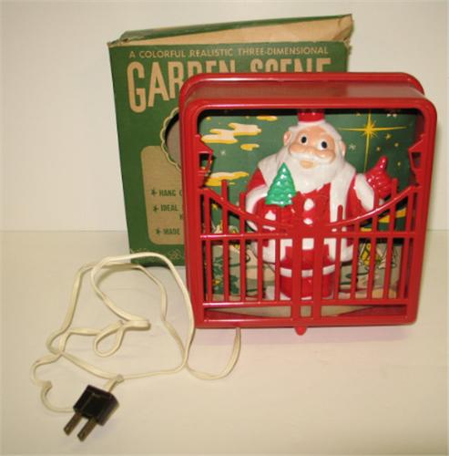 PLASTIC SANTA SCENE WITH ORIGINAL BOX. Box is marked “A Colorful Realistic Three-Dimensional Garden Scene, Harett-Gilmar Inc., New York City, U.S.A.” Scene depicts a plastic Santa in red outfit with plastic frame and fence. Scene is electrical and illuminates the Santa figure. Scene is in excellent condition as well as the original box. 7.75” x 7.75”