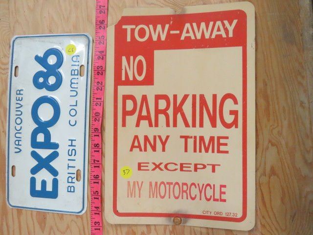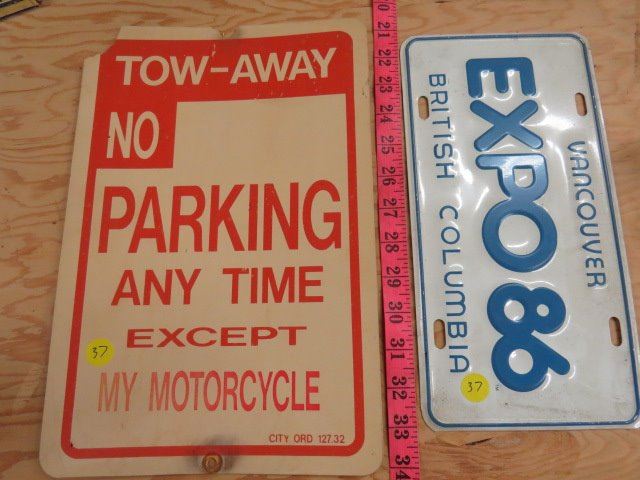 PLASTIC SIGN AND LICENSE PLATE (TOW AWAY AND VANCOUVER EXPO 1986)